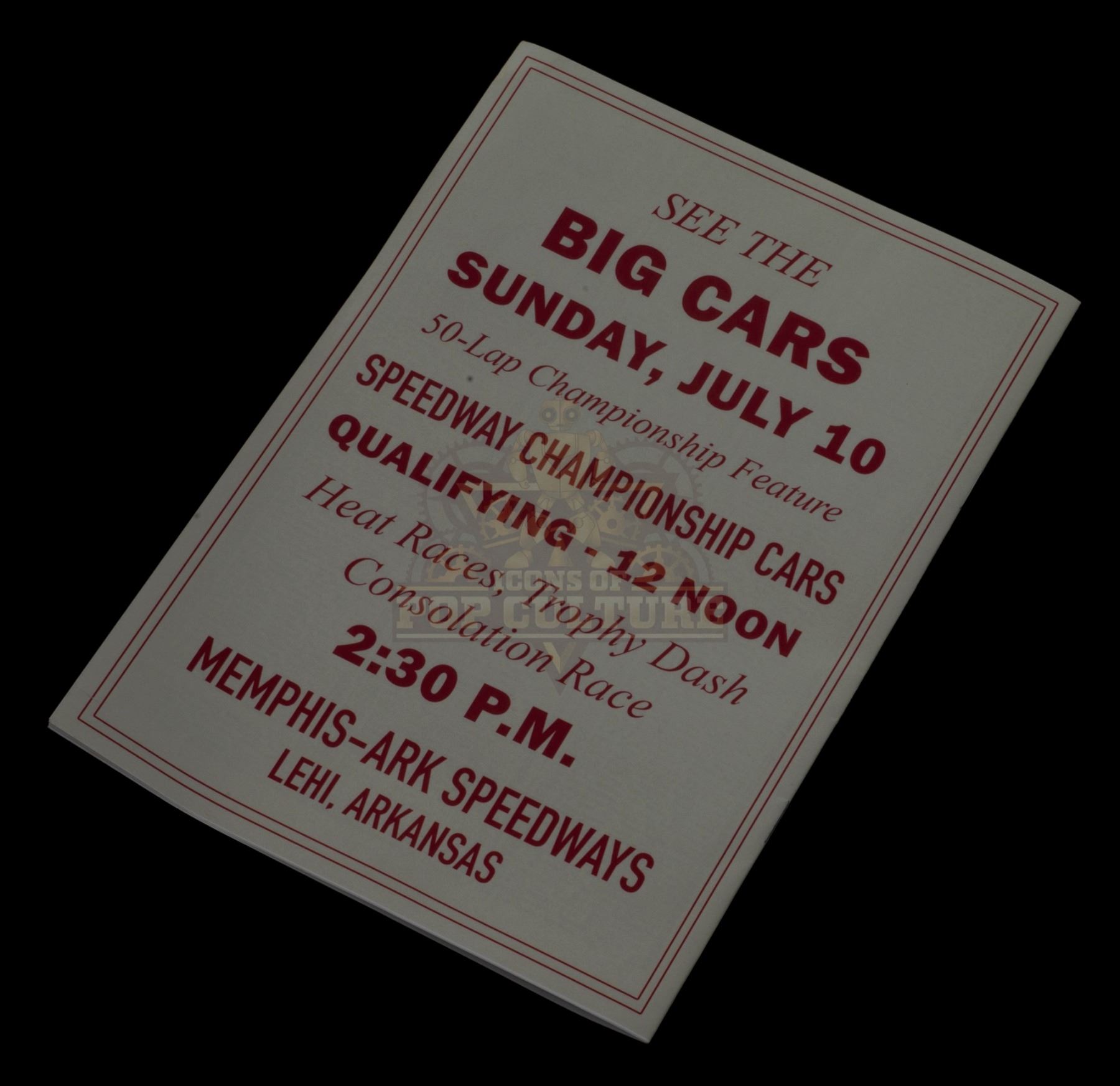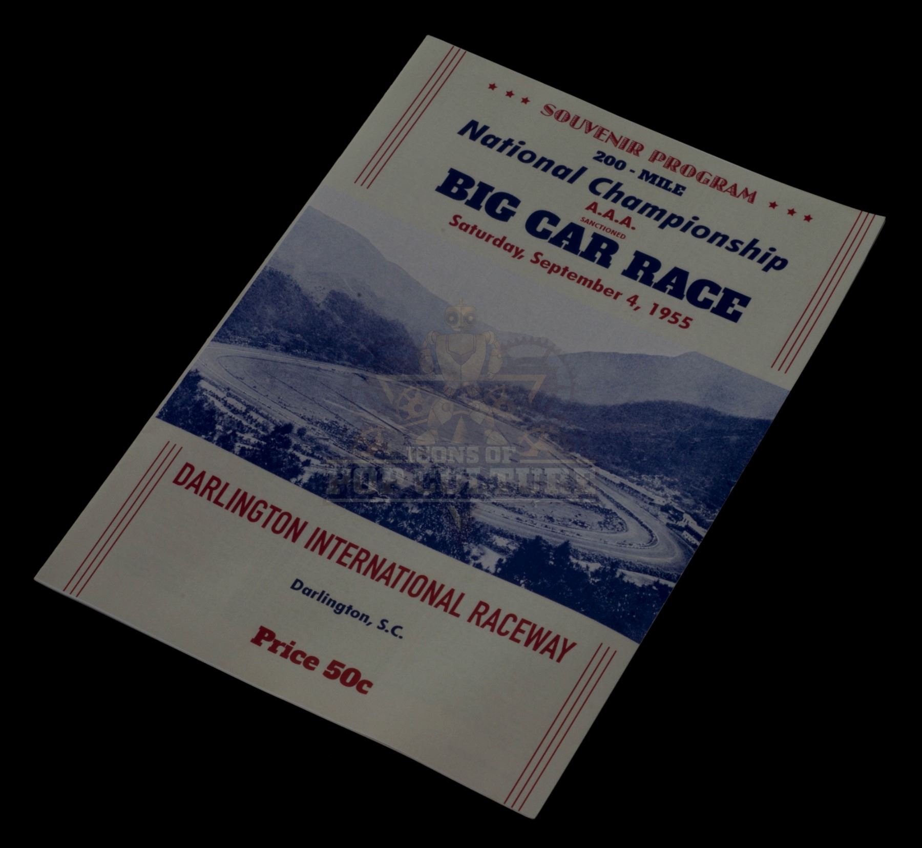 This prop souvenir program was custom printed by the production for use by various actors and as set dressing in the season two episode titled “The Darlington 500”. The souvenir program measures 10.5” x 7.5” and features the image of the Darlington International Raceway, with the date Saturday, September 4, 1955.