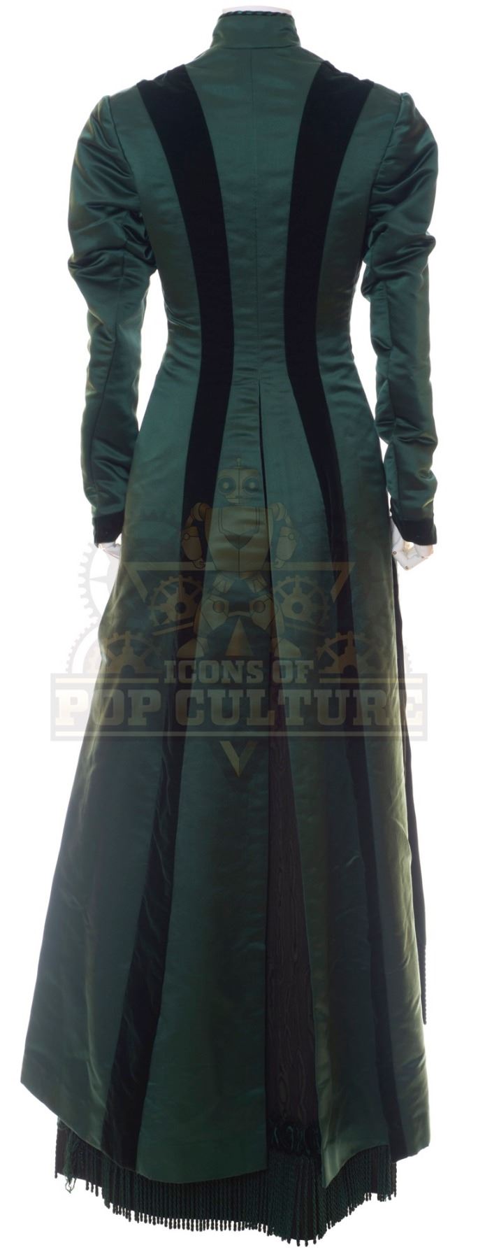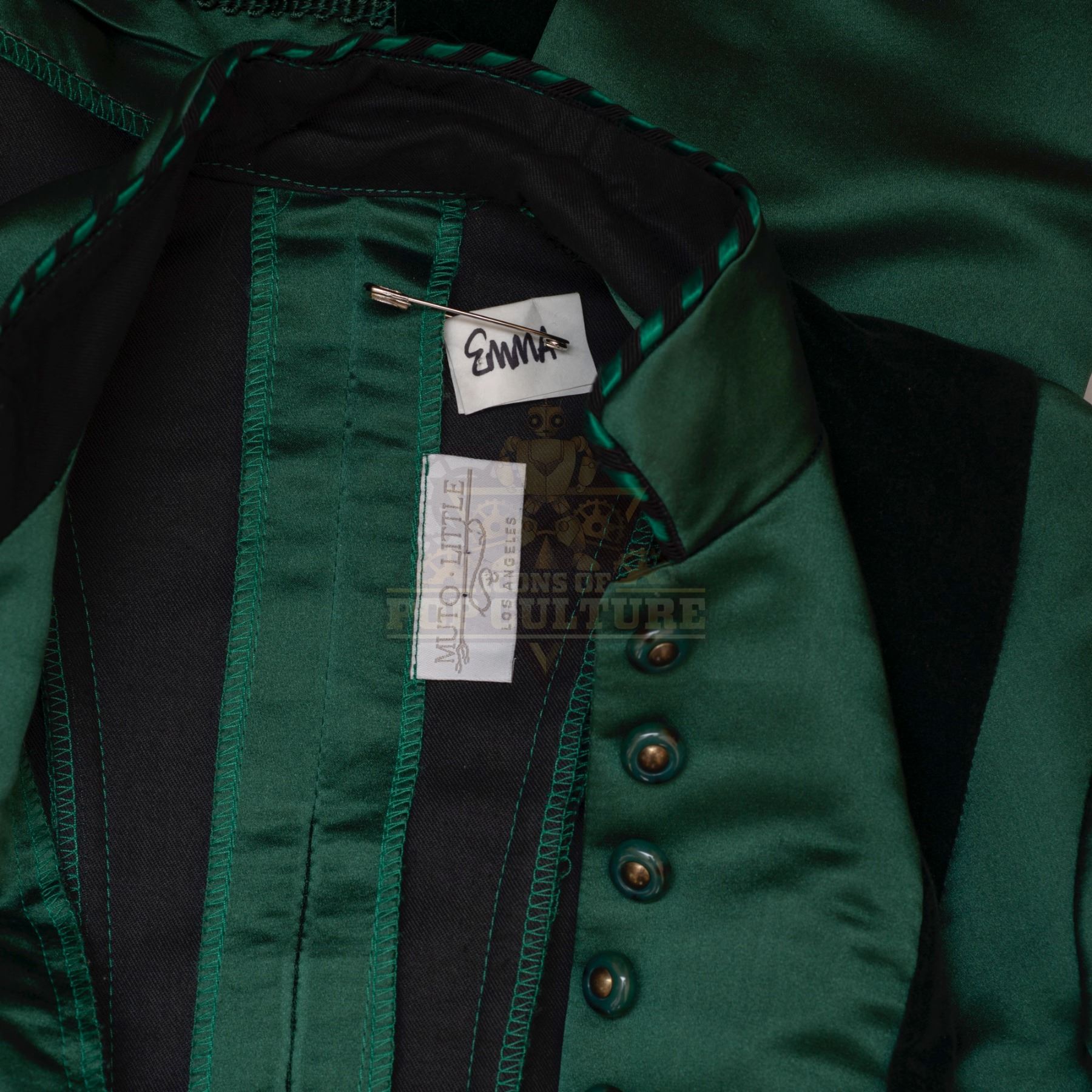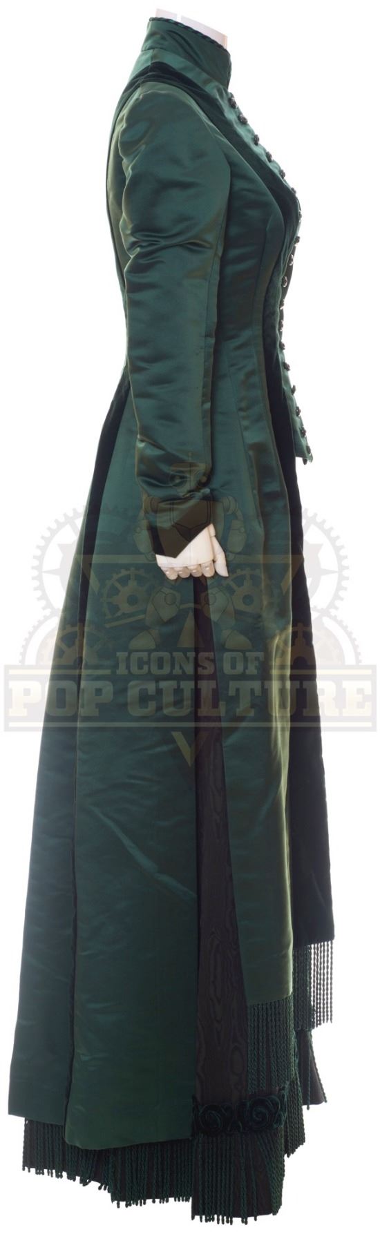 This outfit was custom-made by the production for use by Annie Wersching as “Emma Whitmore” in the season two episode titled “Chinatown”. The 1880’s style outfit consists of an emerald green dress with tassel fringe at the bottom and a dark green skirt with fringe tassels at hem.