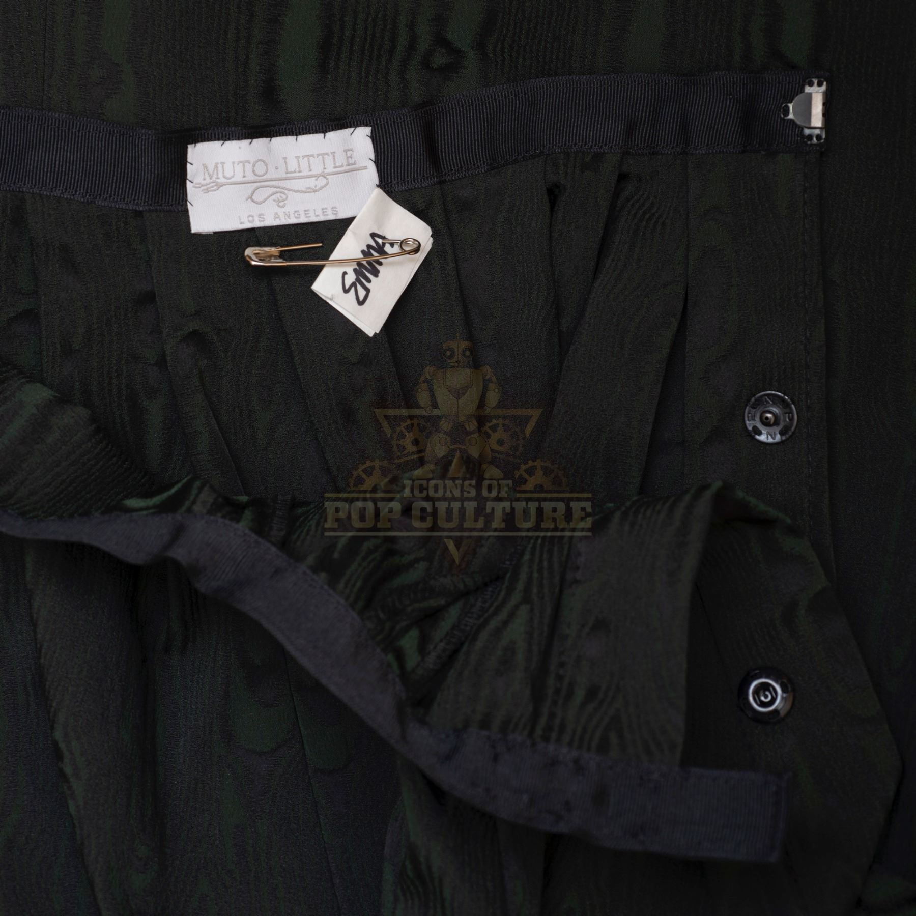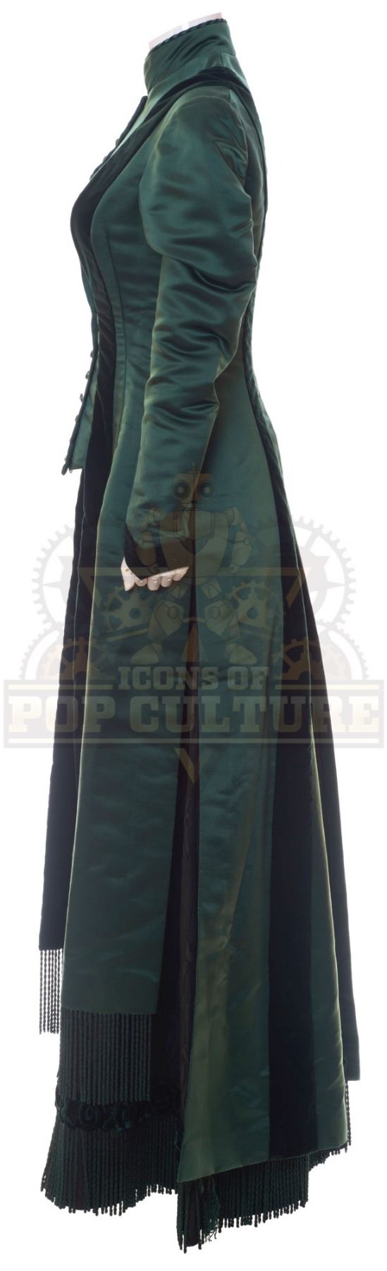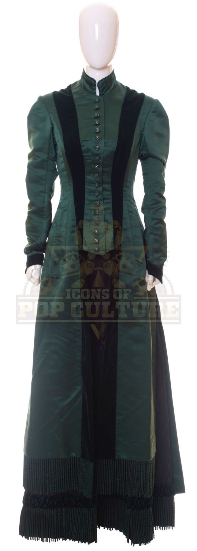 This outfit was custom-made by the production for use by Annie Wersching as “Emma Whitmore” in the season two episode titled “Chinatown”. The 1880’s style outfit consists of an emerald green dress with tassel fringe at the bottom and a dark green skirt with fringe tassels at hem.