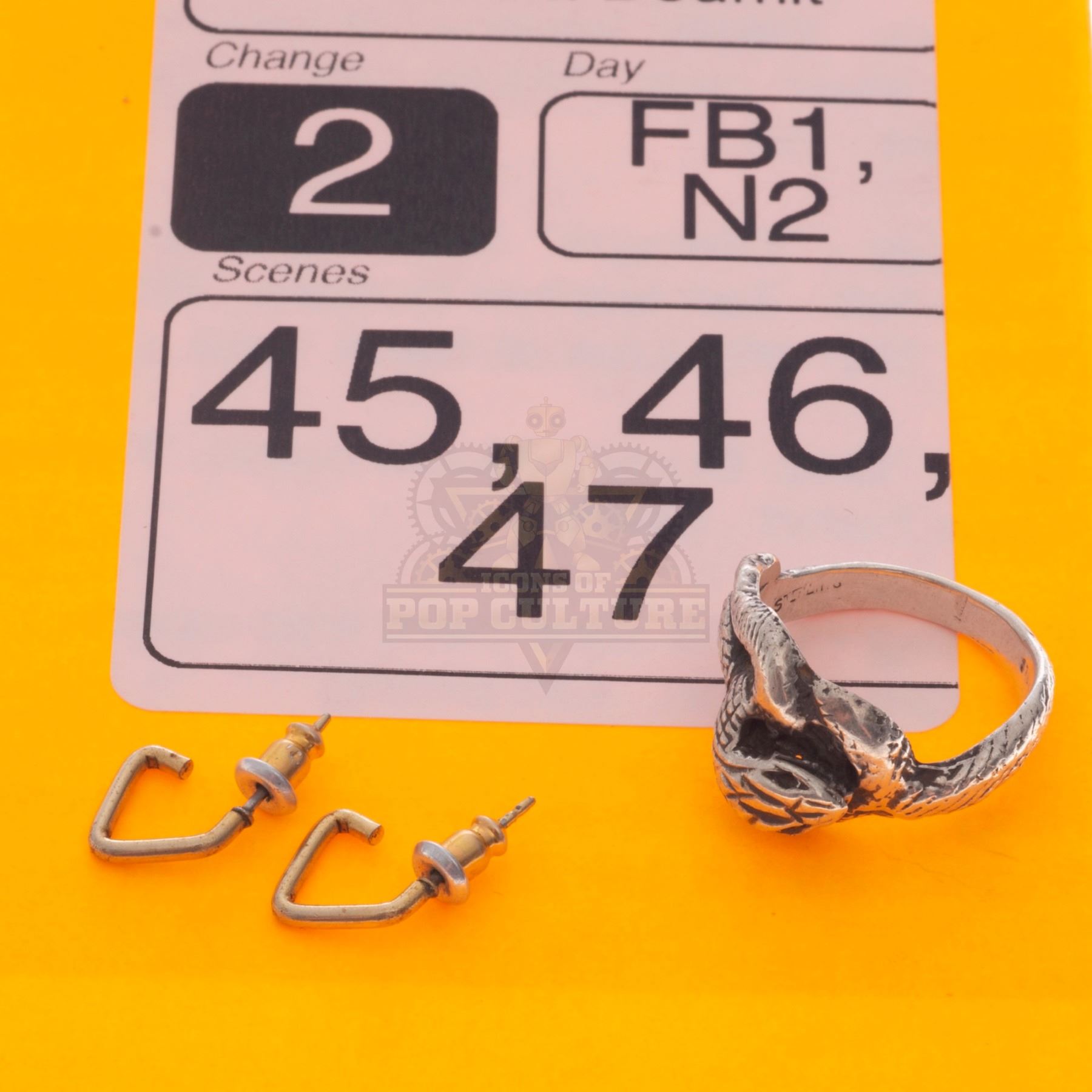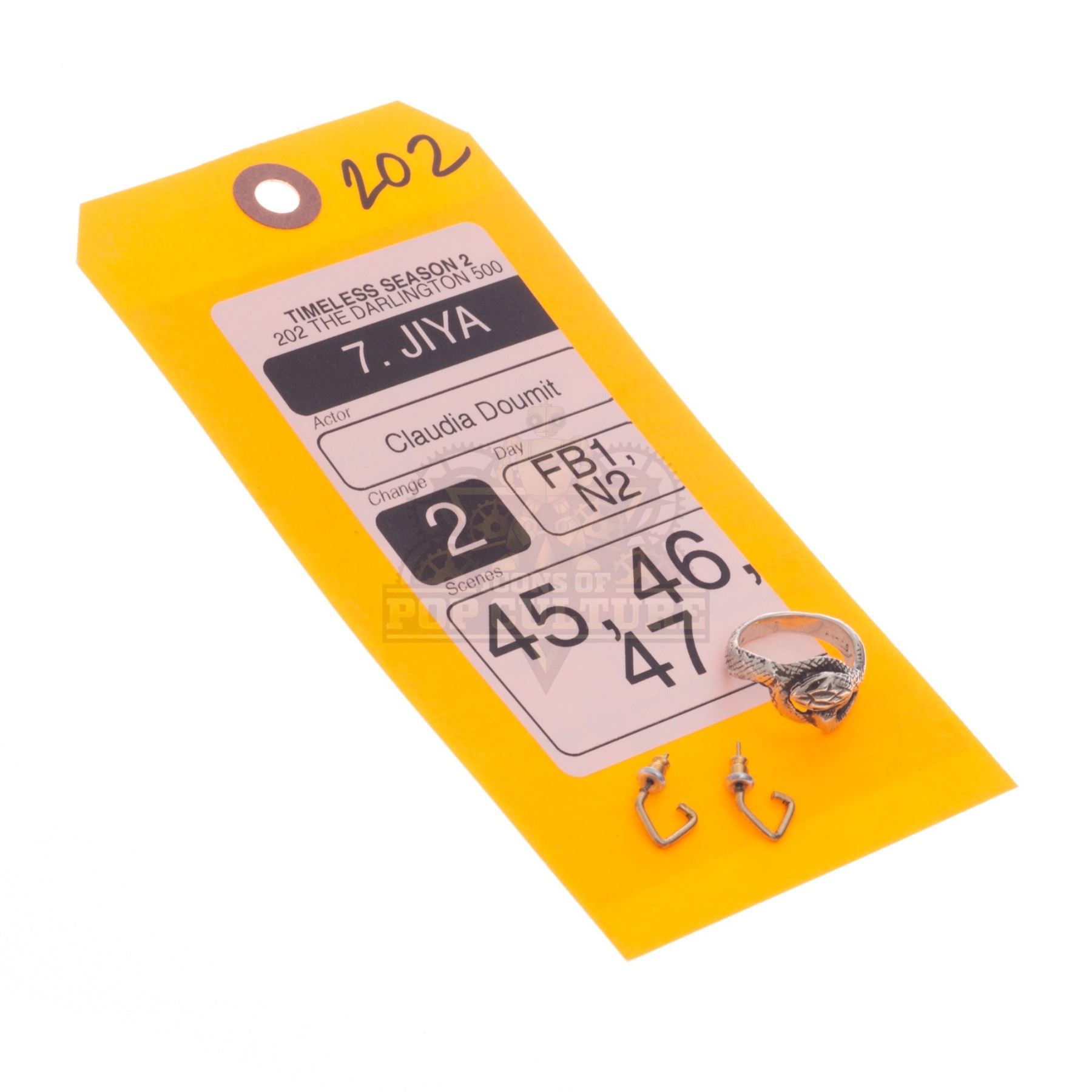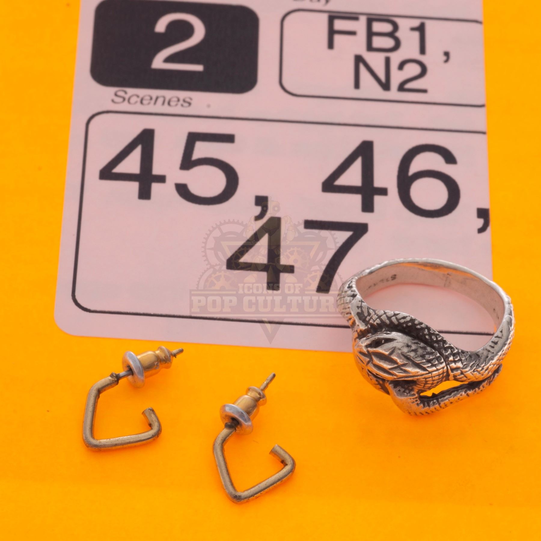 This pair of earrings and ring were acquired by the production for use by Claudia Doumit as “Jiya” in the season two episode titled “The Darlington 500”. The pewter ring consists of a snake wrapped around with its head and tail knotted on top. The gold color wire earrings are bent into an open triangle shape. Included with the earrings and ring is a production used costume tag that details the entire outfit, episode title, change number and scene numbers used.