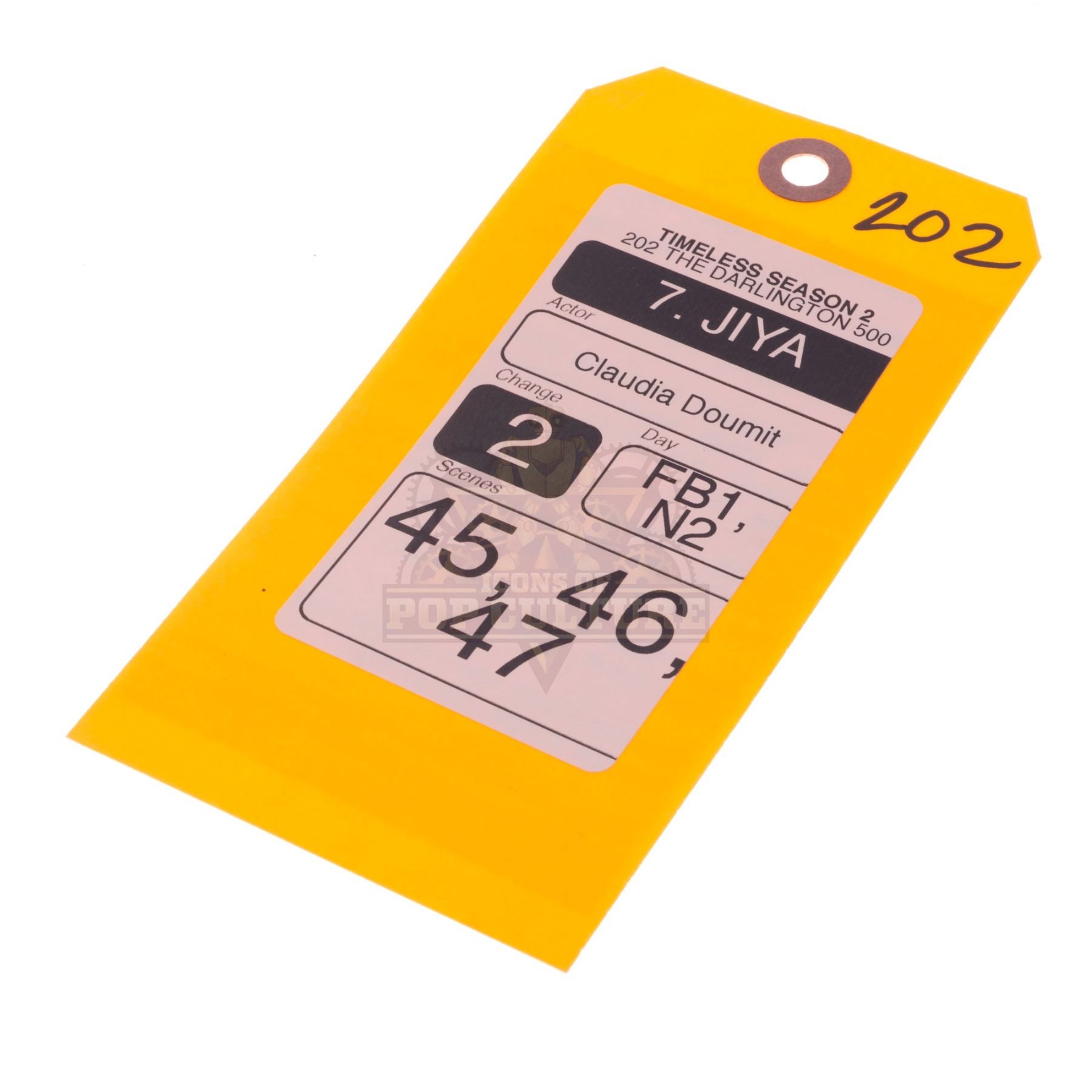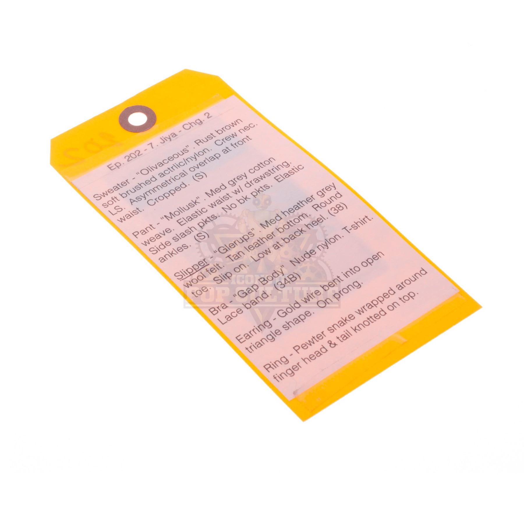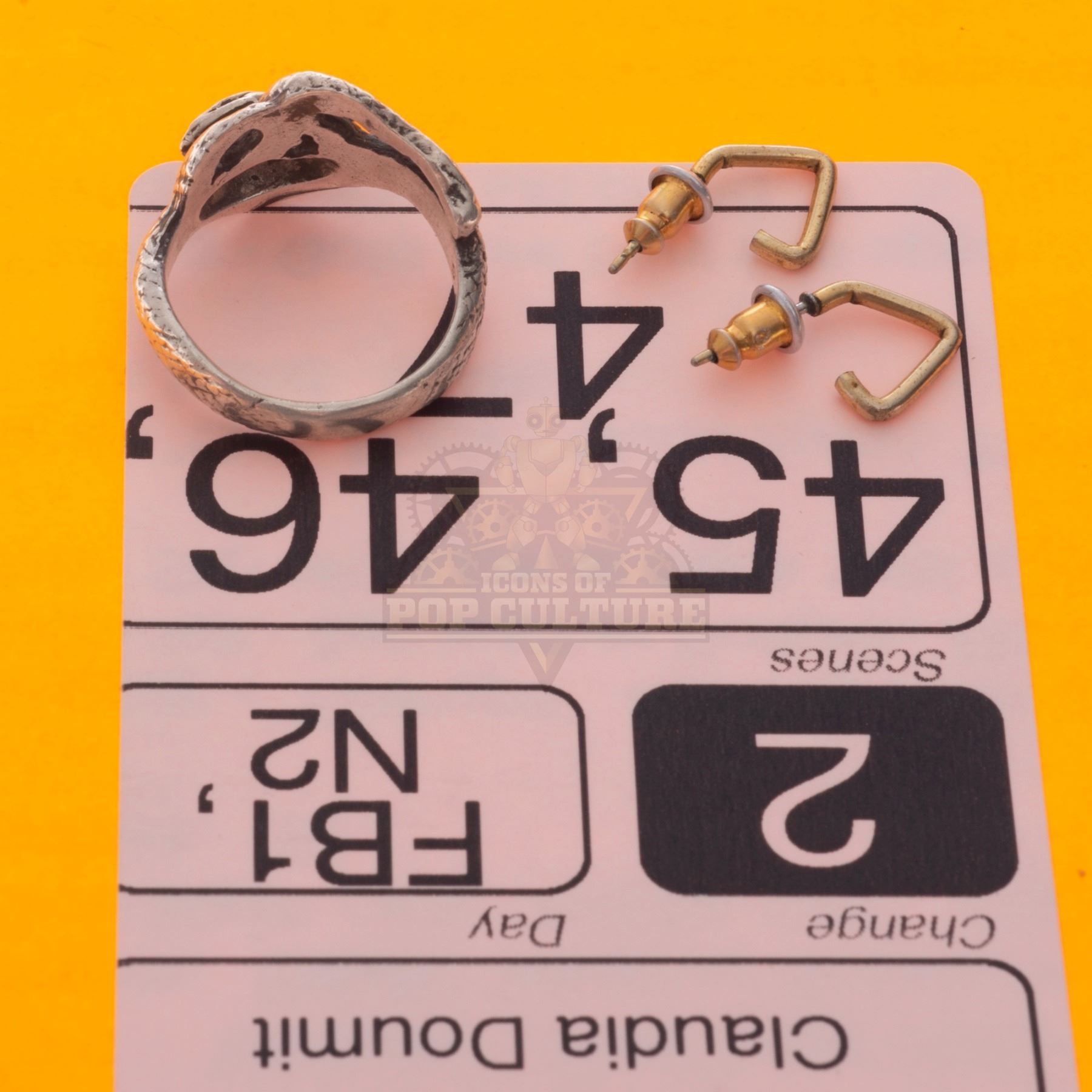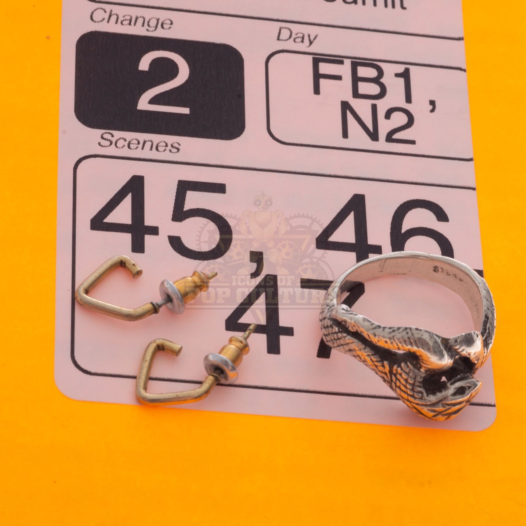 This pair of earrings and ring were acquired by the production for use by Claudia Doumit as “Jiya” in the season two episode titled “The Darlington 500”. The pewter ring consists of a snake wrapped around with its head and tail knotted on top. The gold color wire earrings are bent into an open triangle shape. Included with the earrings and ring is a production used costume tag that details the entire outfit, episode title, change number and scene numbers used.