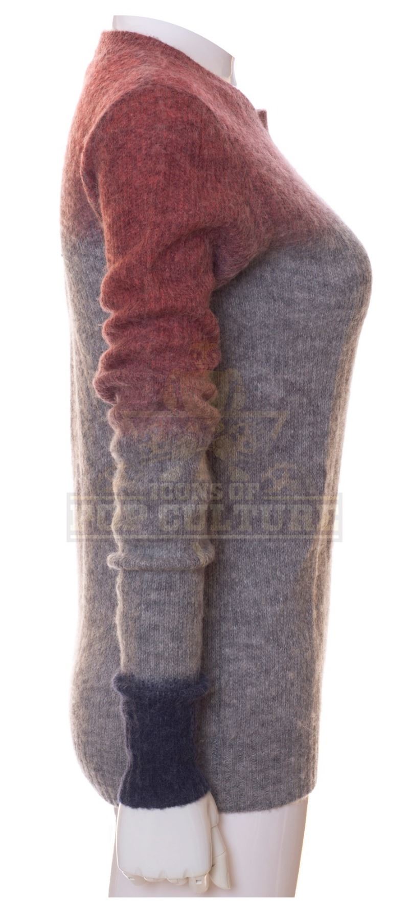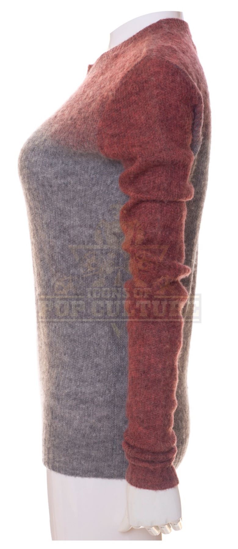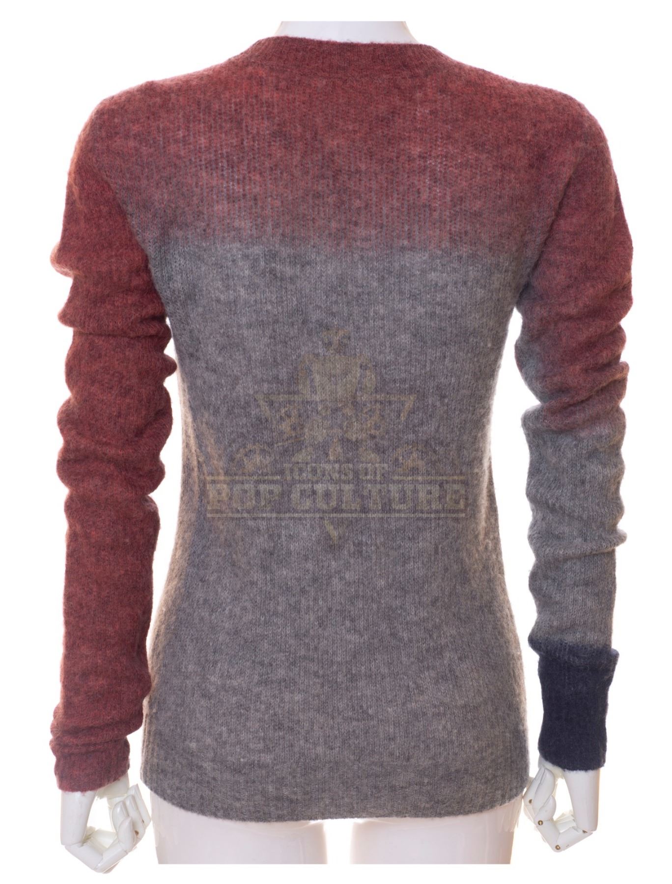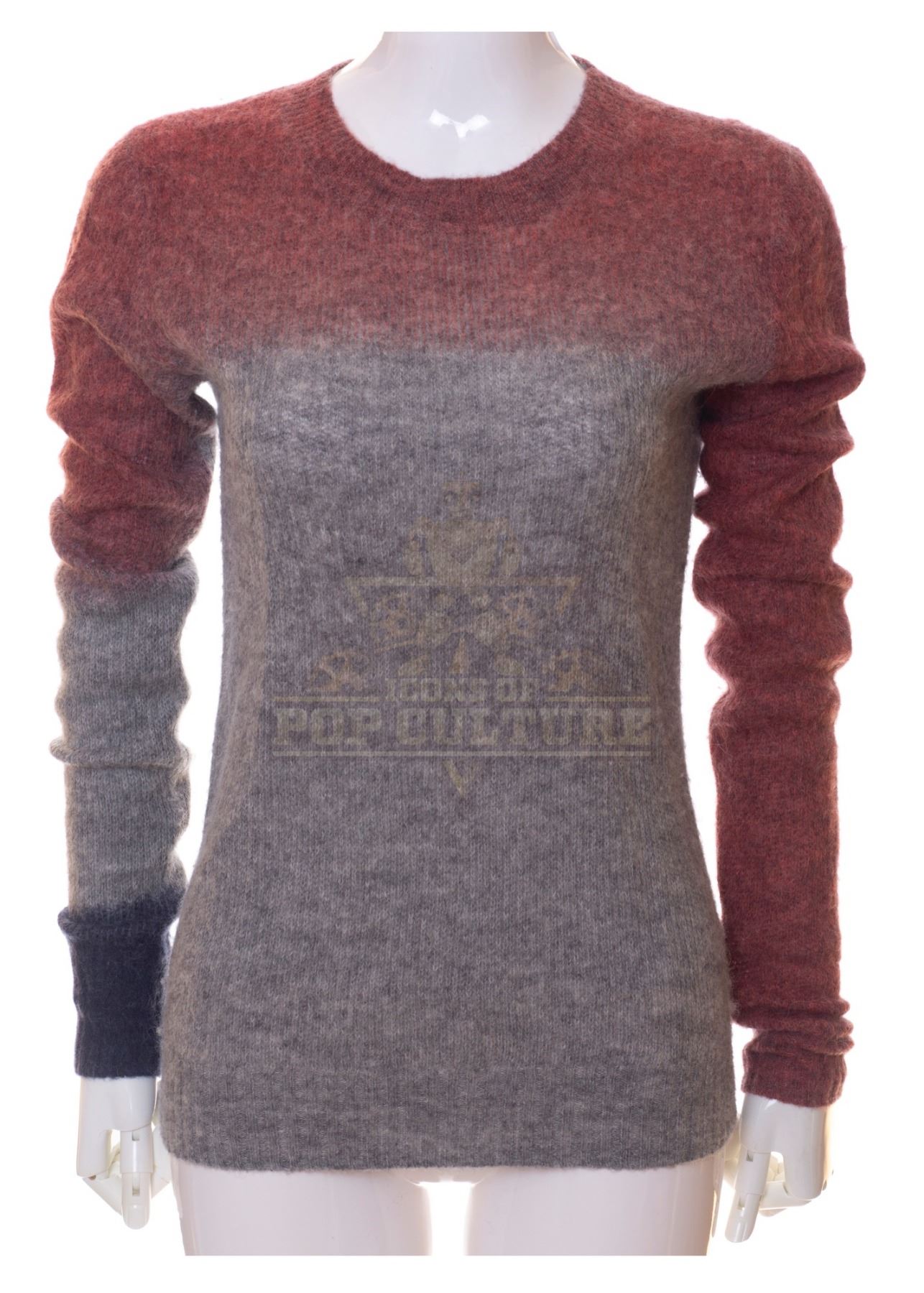 This sweater was acquired by the production for use by Abigail Spencer as “Lucy Preston” in the season one episode titled “Last Ride of Bonnie & Clyde”. The grey sweater features a fade to red at the shoulders and arms and blue cuffs.