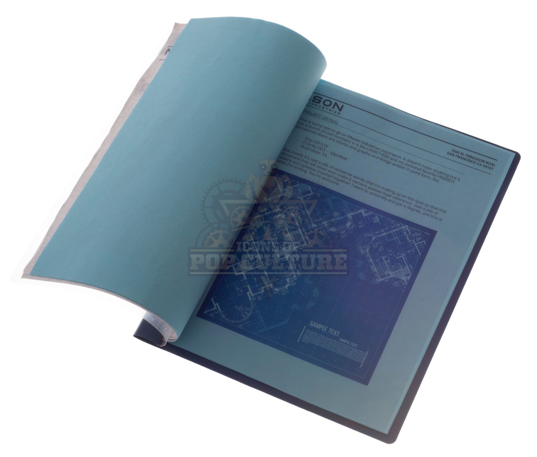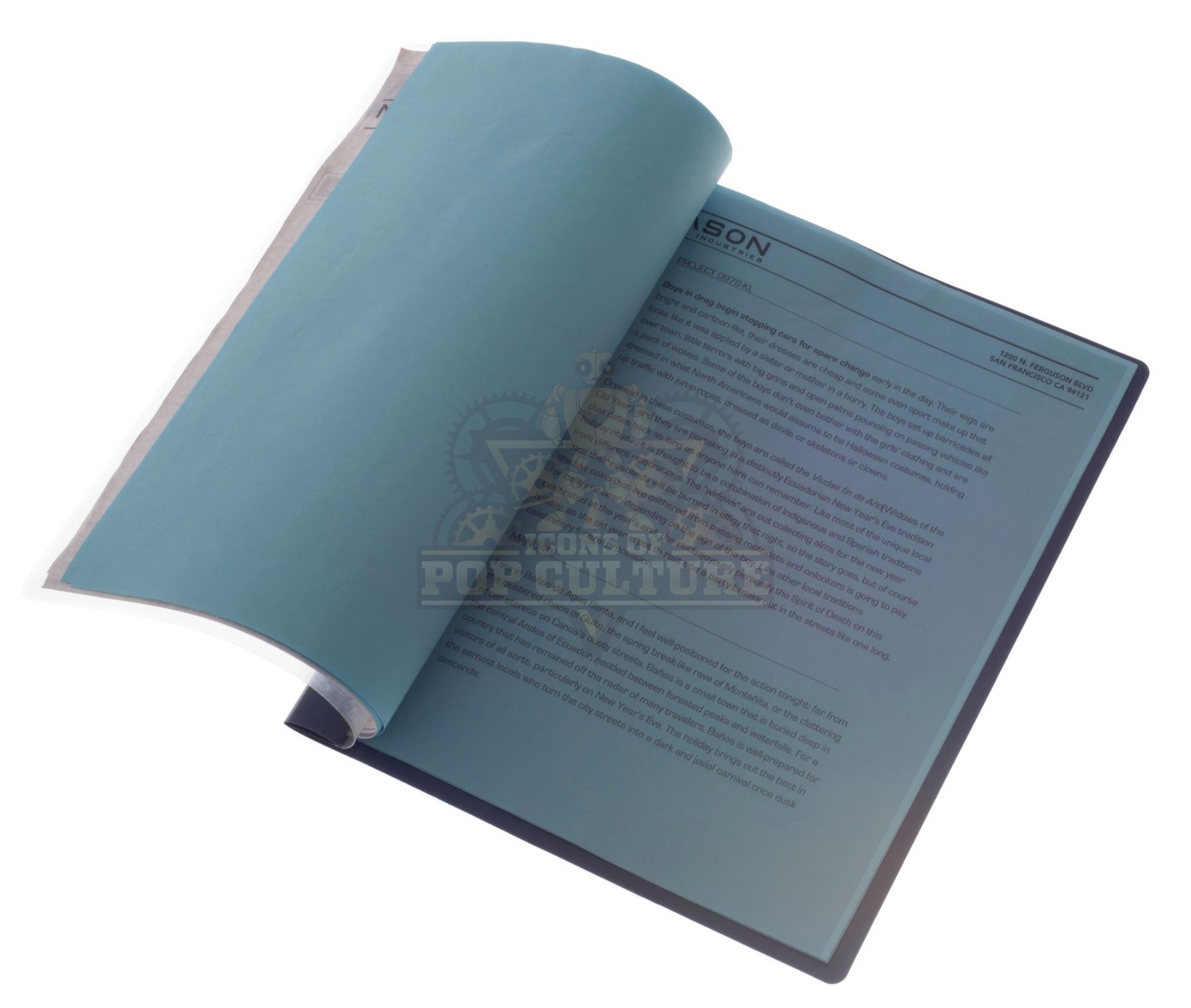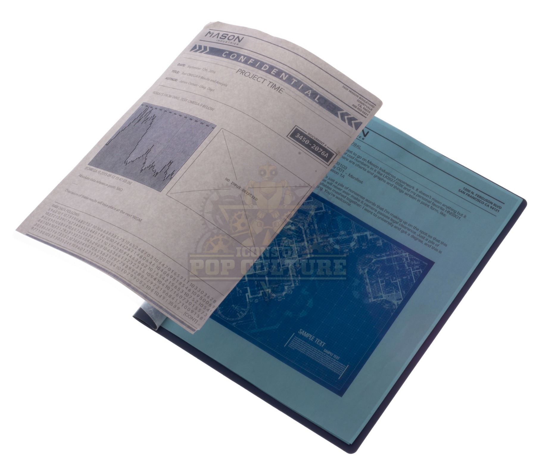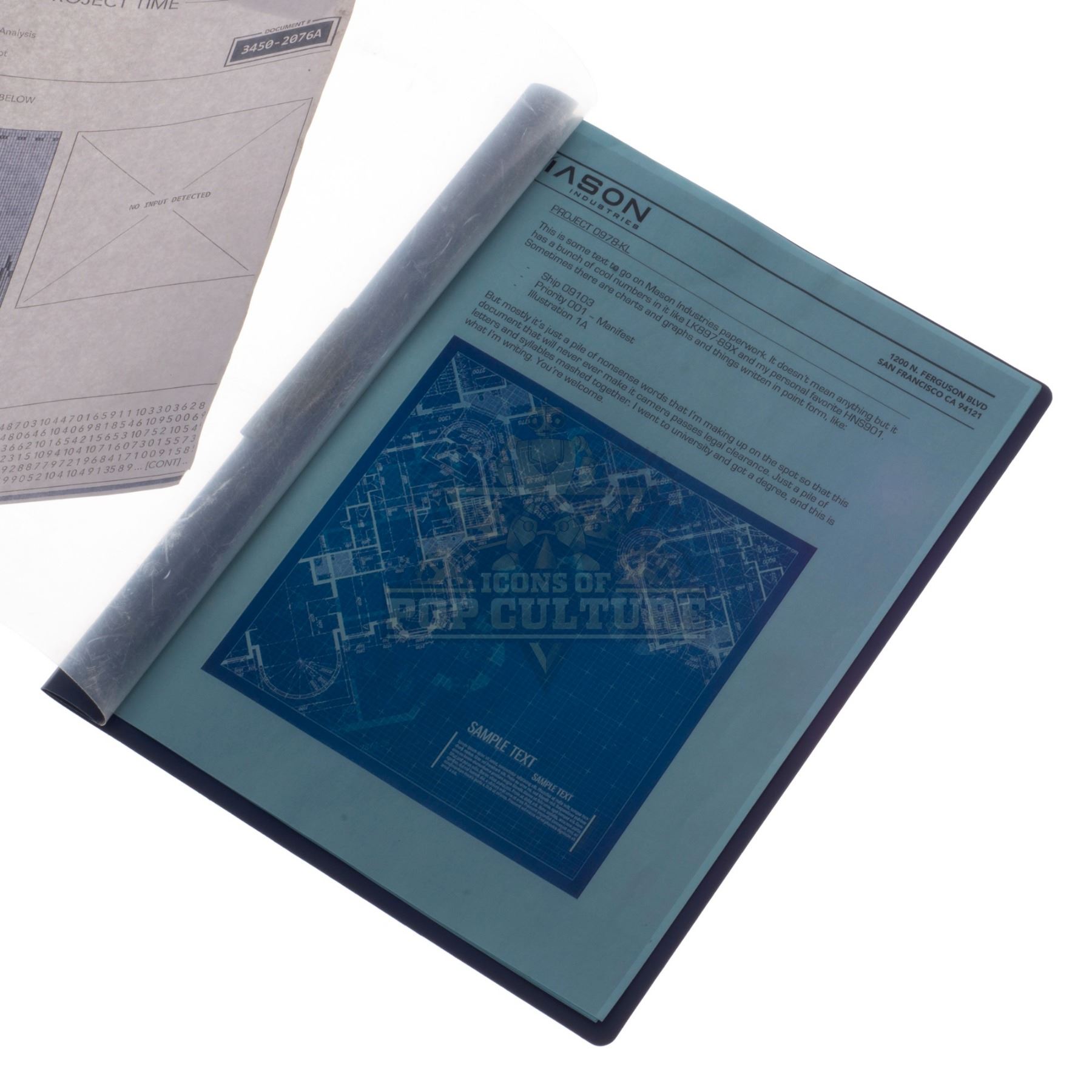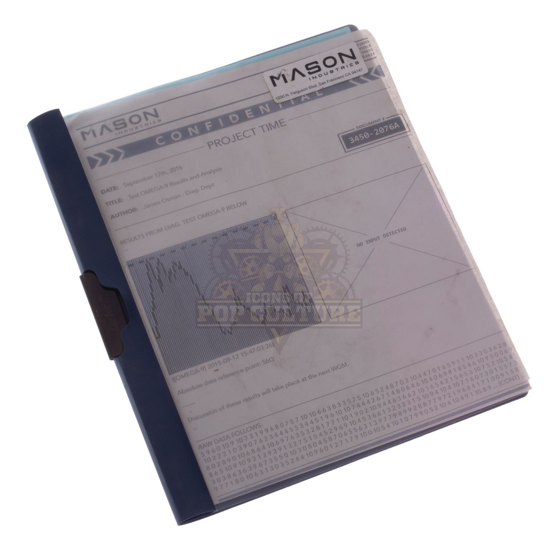This “Mason Industries” folder was acquired by the production for use by various actors and as set dressing during filming of the series. The folder features a custom printed “Mason Industries” label applied to the cover and contains several “Mason Industries” filler pages.
