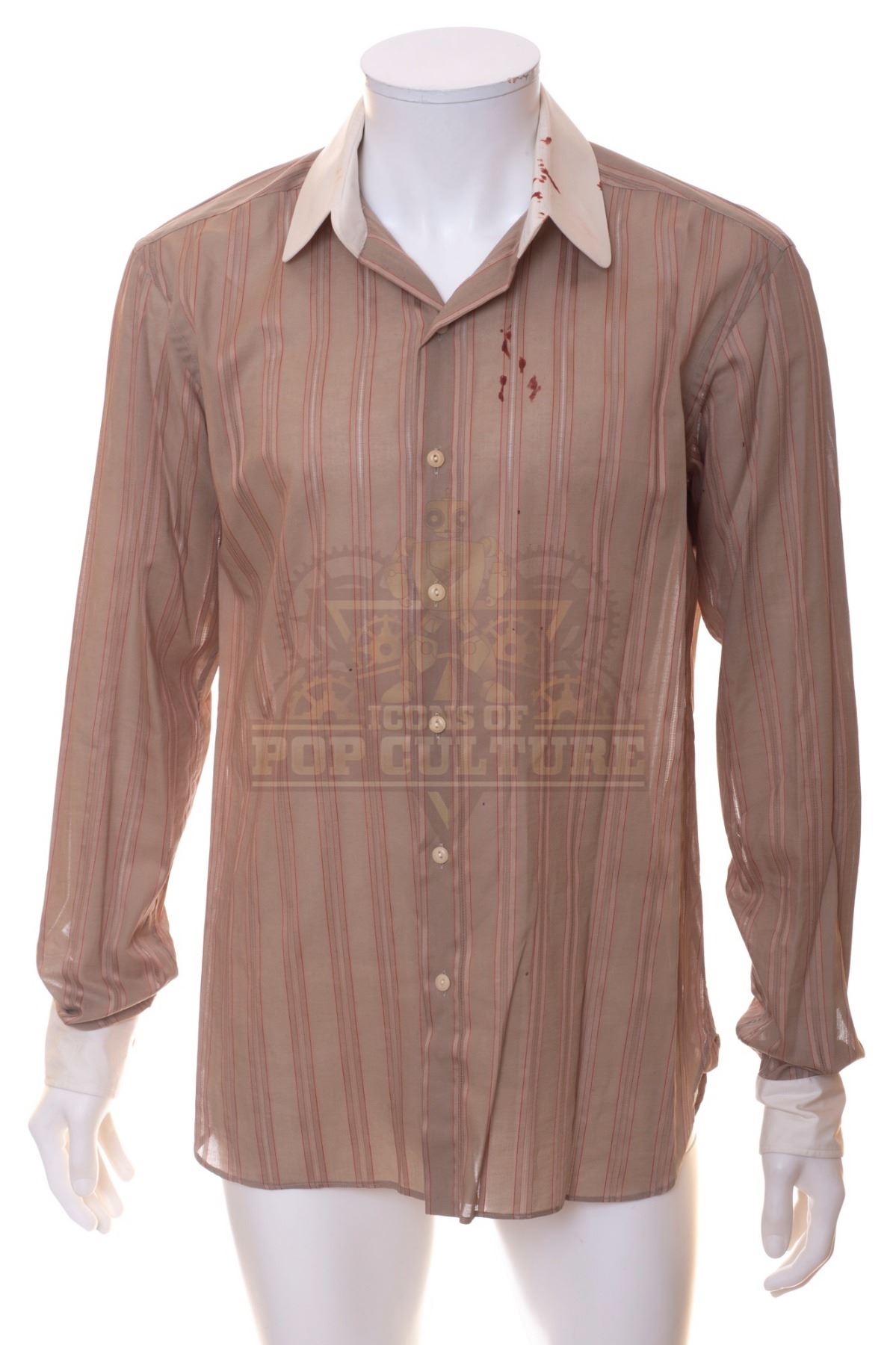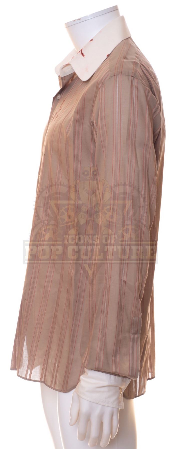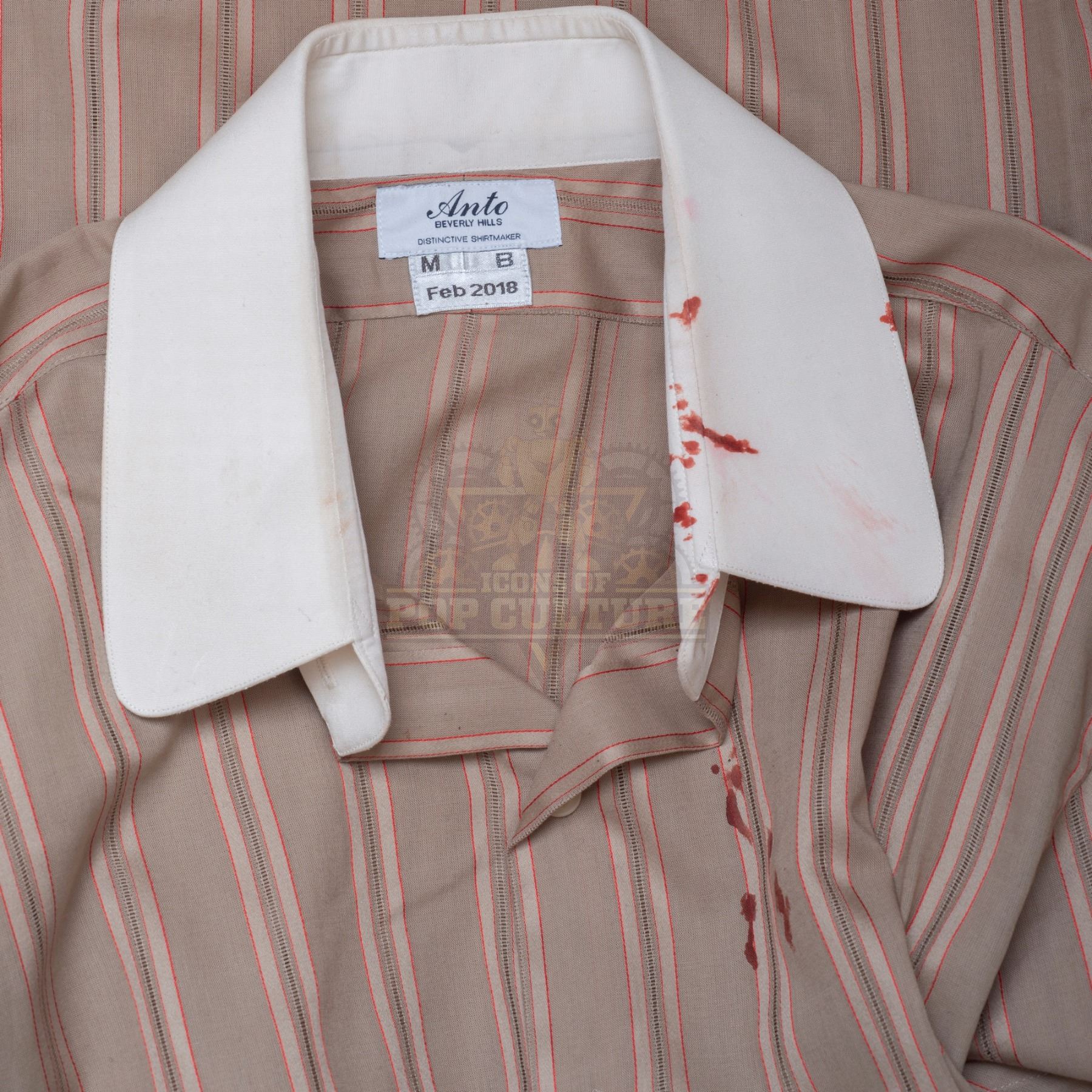 This shirt was custom-made by Anto Beverly Hills for use by Malcolm Barrett as “Rufus Carlin” in the season two episode titled “Mrs. Sherlock Holmes”. The Anto Beverly Hills shirt, features Malcolm Barrett’s initials on the tag and is dated Feb 2018. The shirt is distressed with studio blood staining for use during filming.