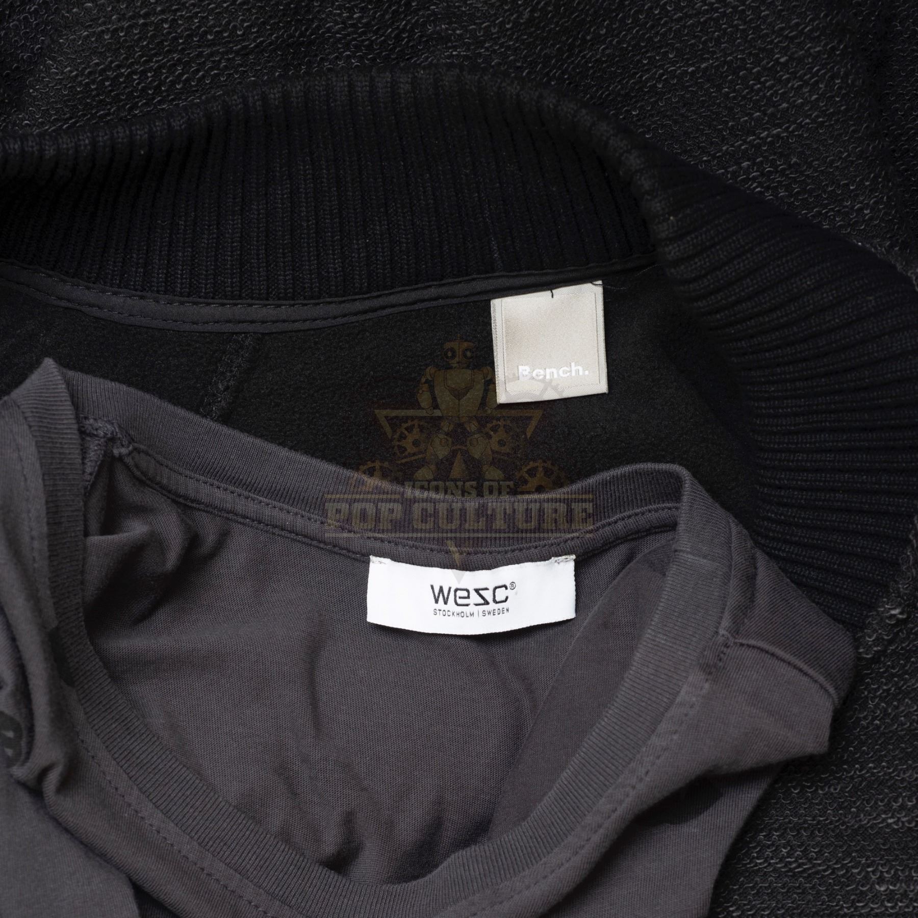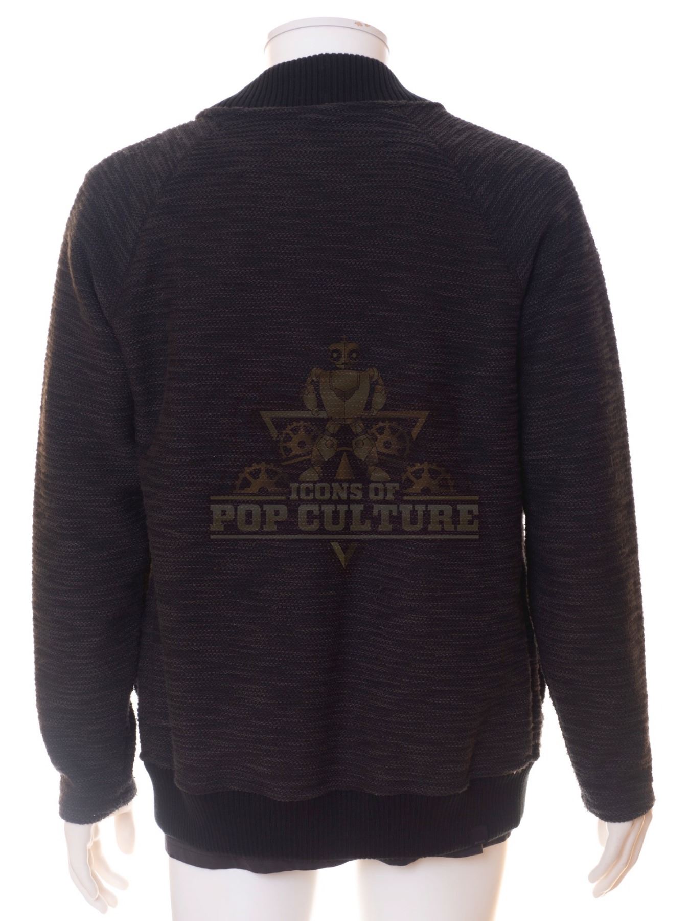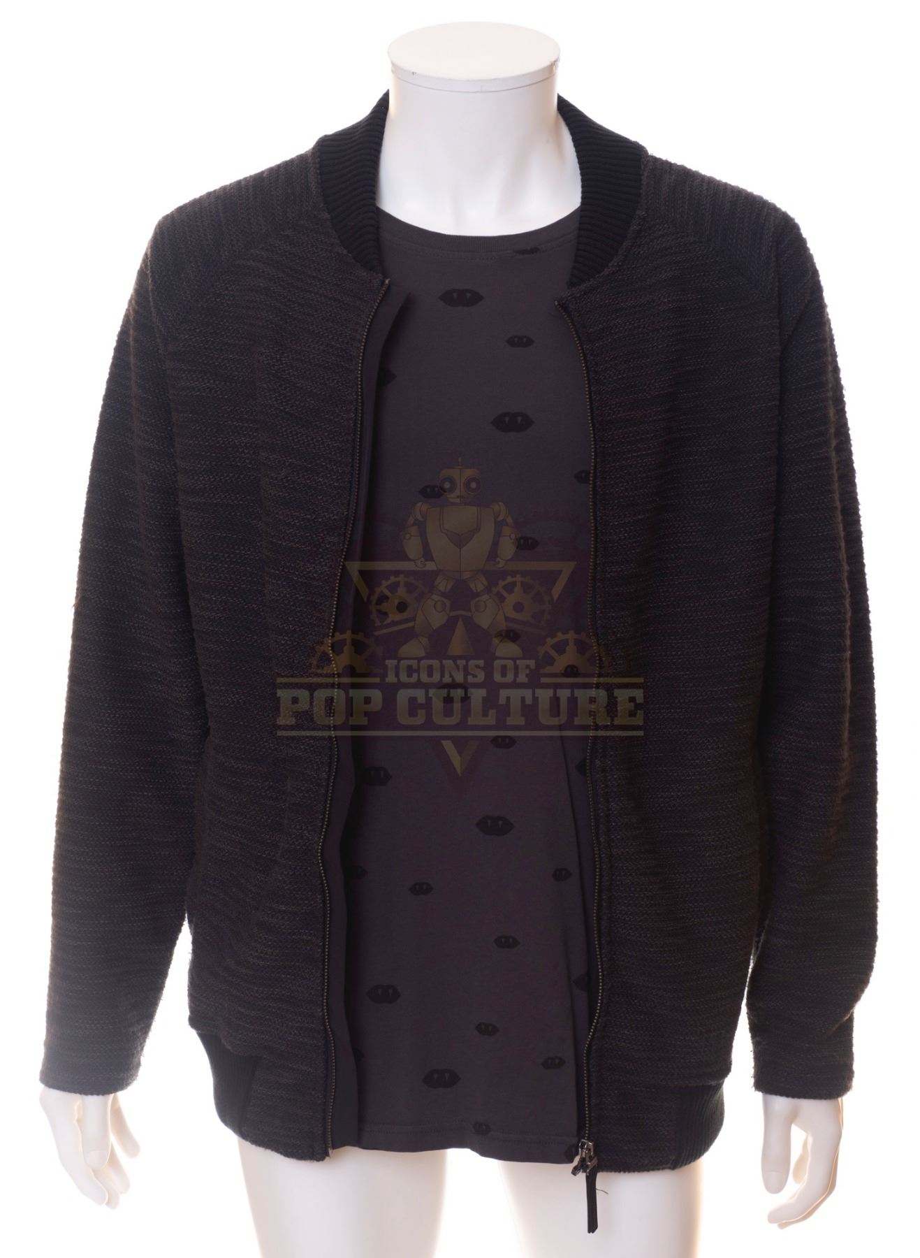 This jacket and shirt were acquired by the production for use by Malcolm Barrett as “Rufus Carlin” in the season two episode titled “The Salem Witch Hunt”. The black jacket features a zip front and two pockets. The black t-shirt features mouth with fangs print detailing.