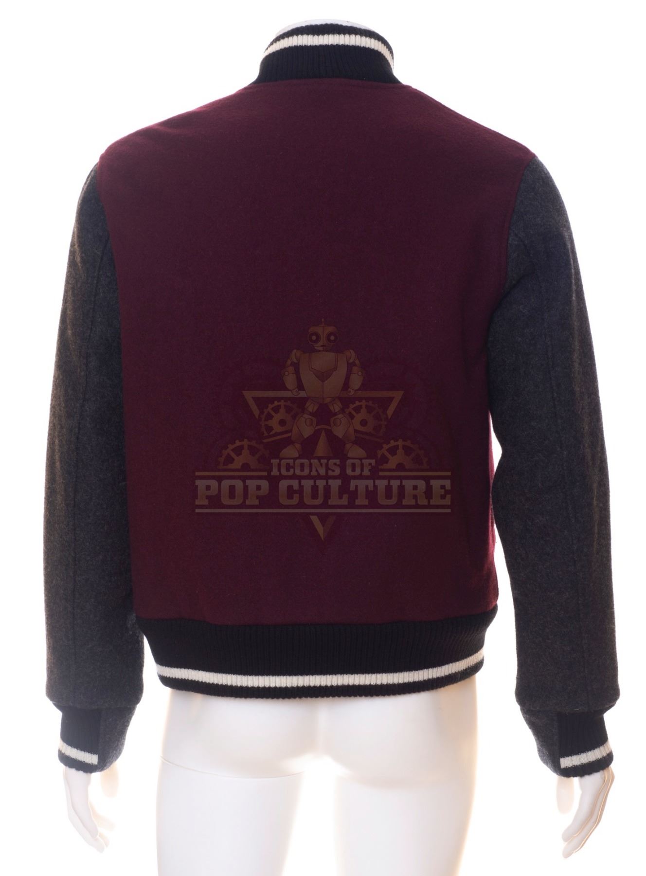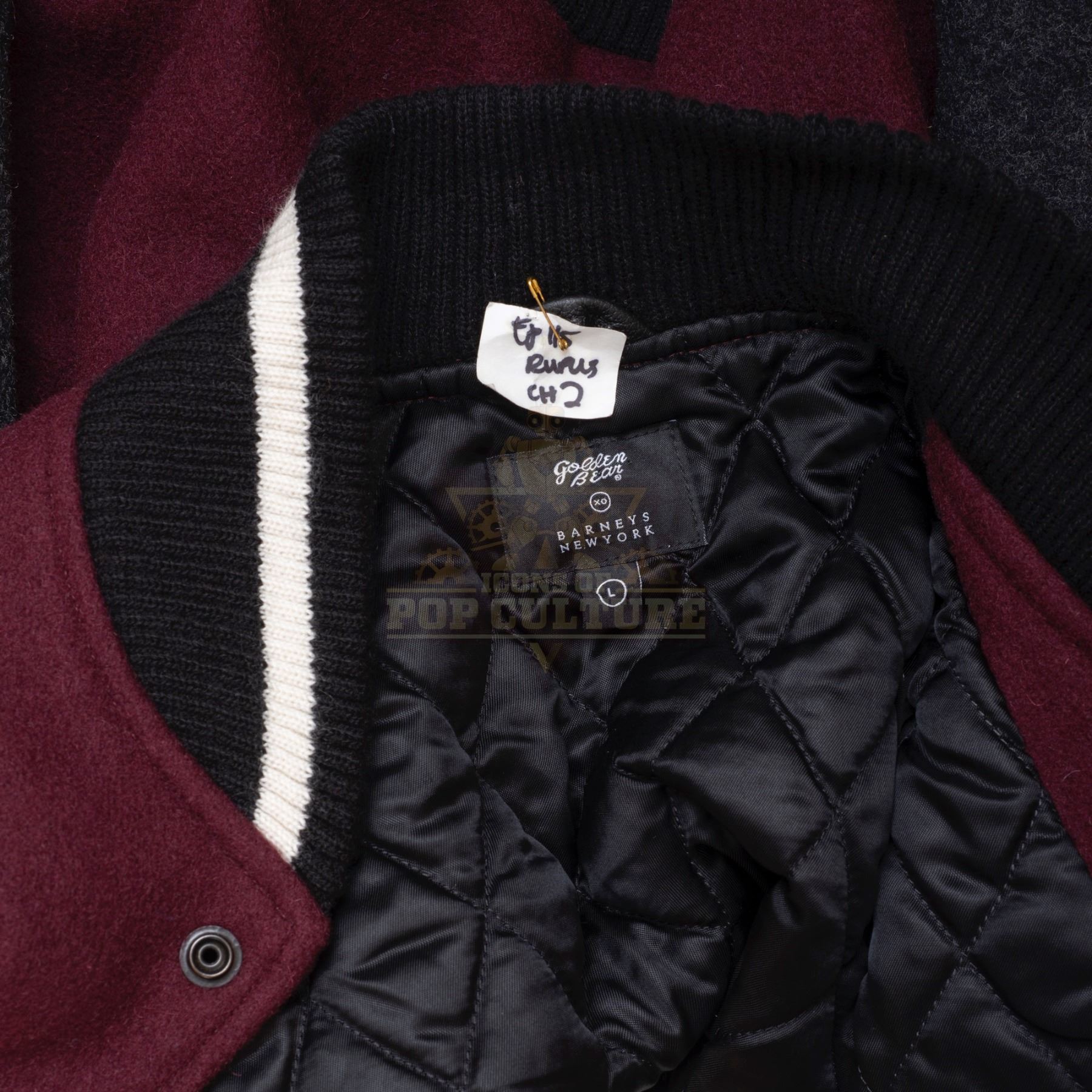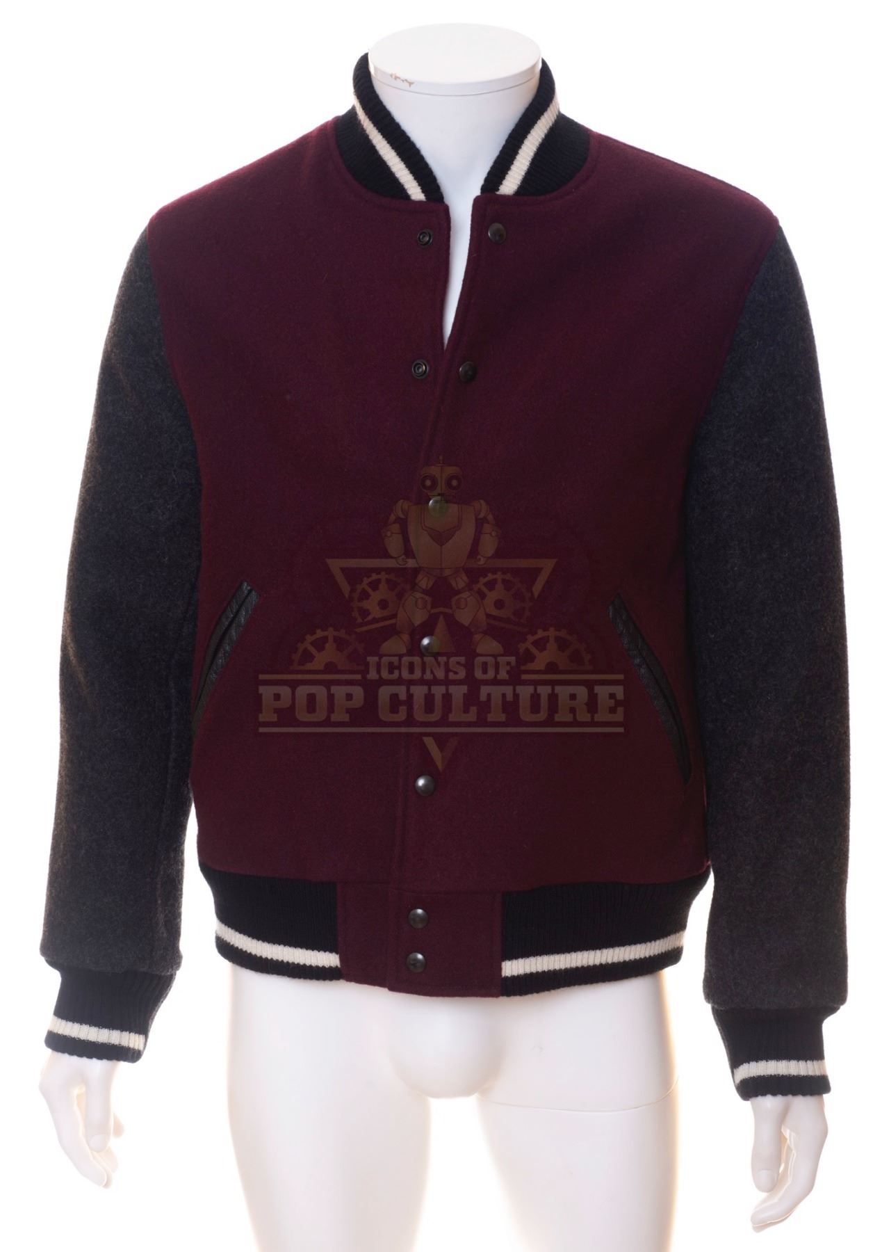 This jacket was acquired by the production for use by Malcolm Barrett as “Rufus Carlin” in the season one episode titled “The Red Scare”. The burgundy jacket features a snap front, grey sleeves and black and white trim.
