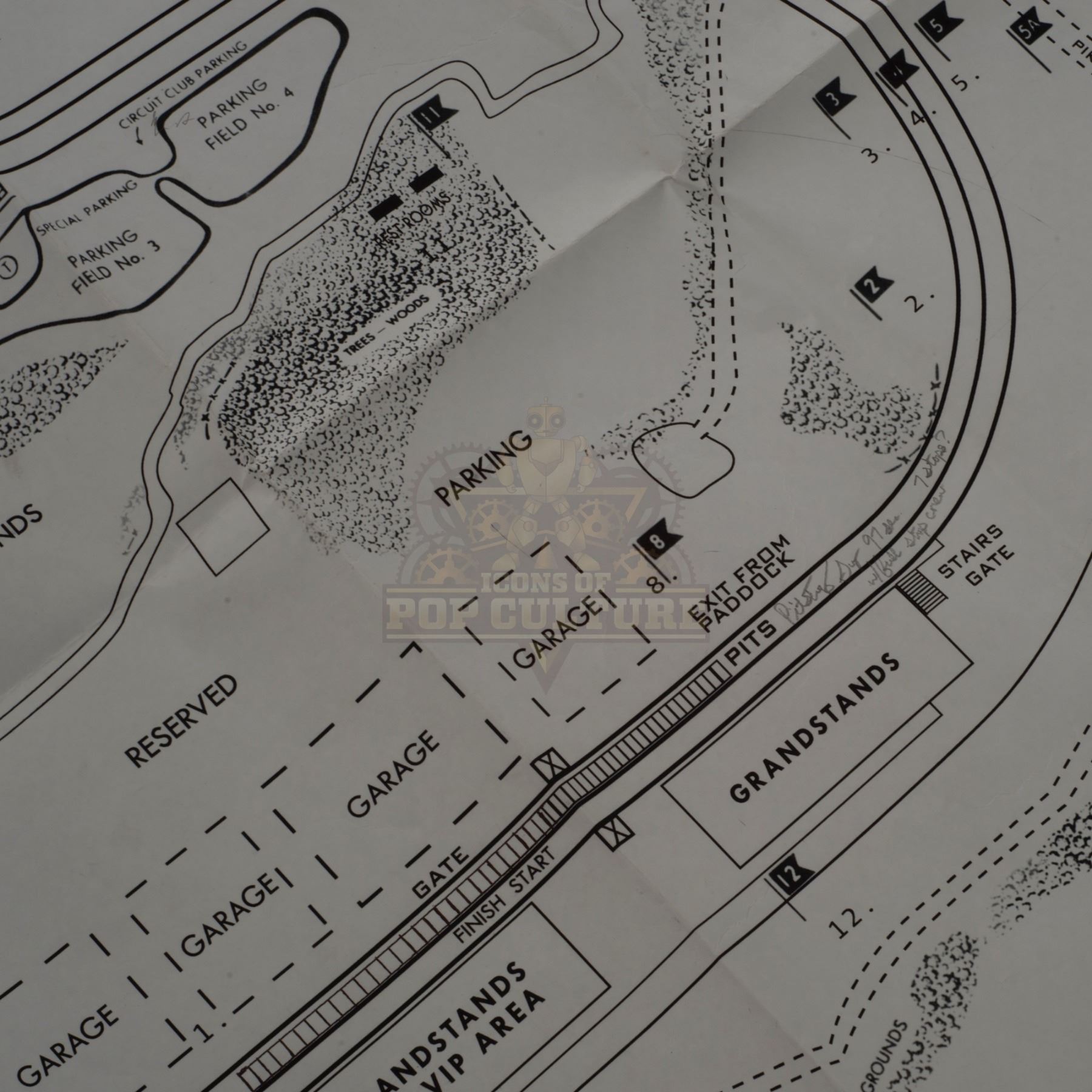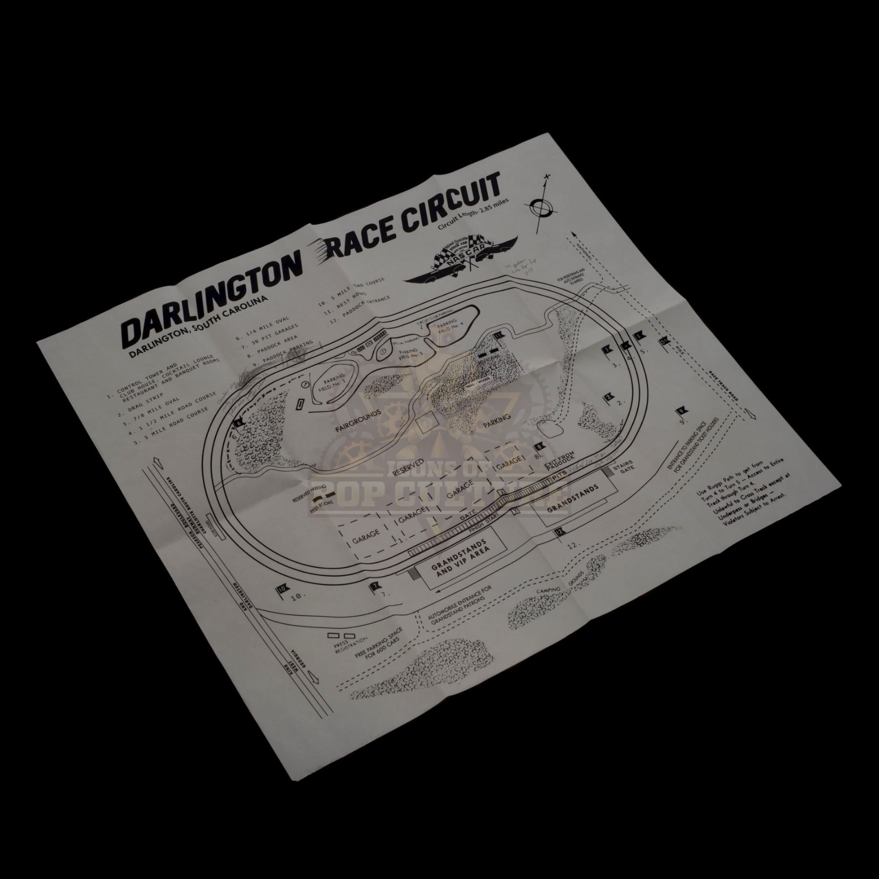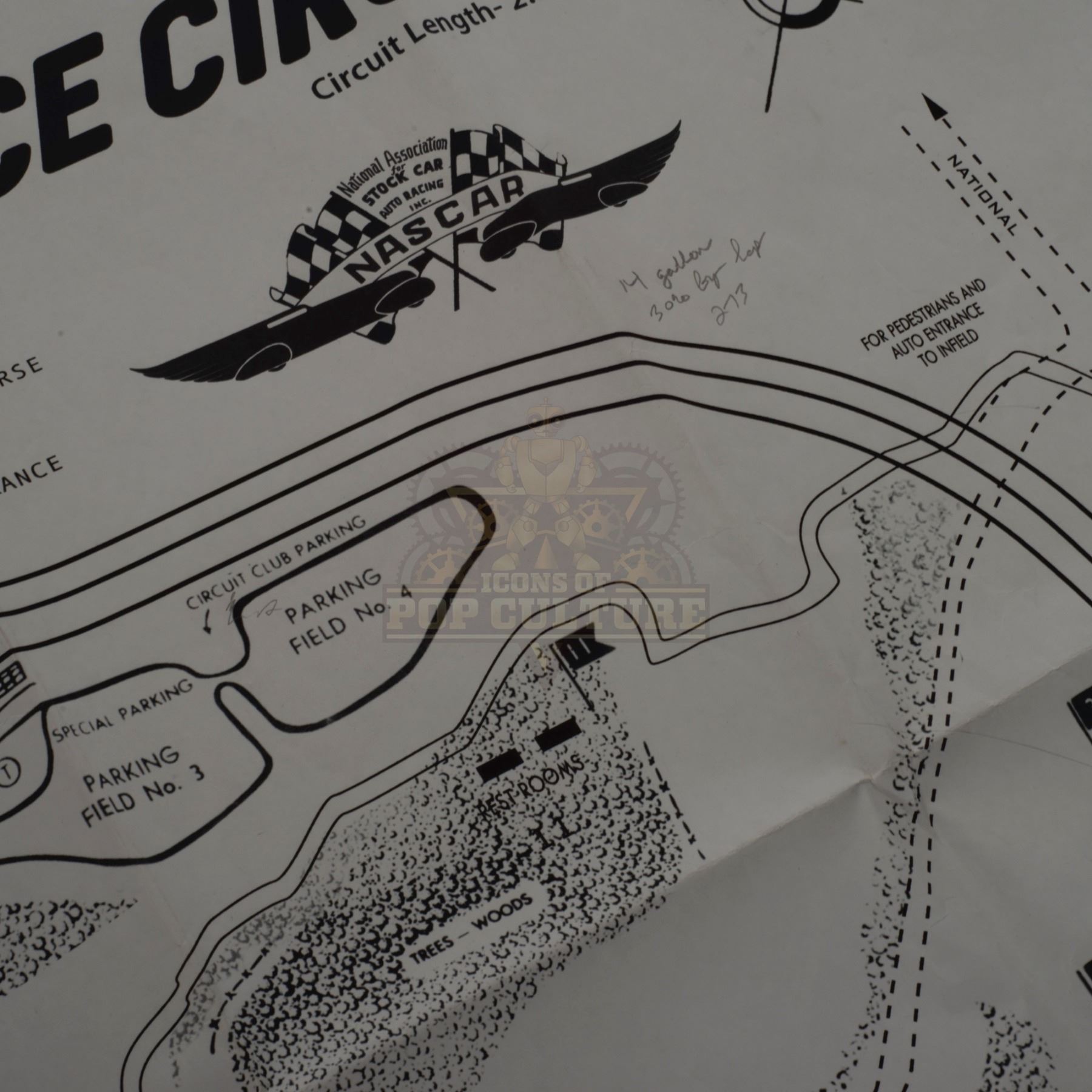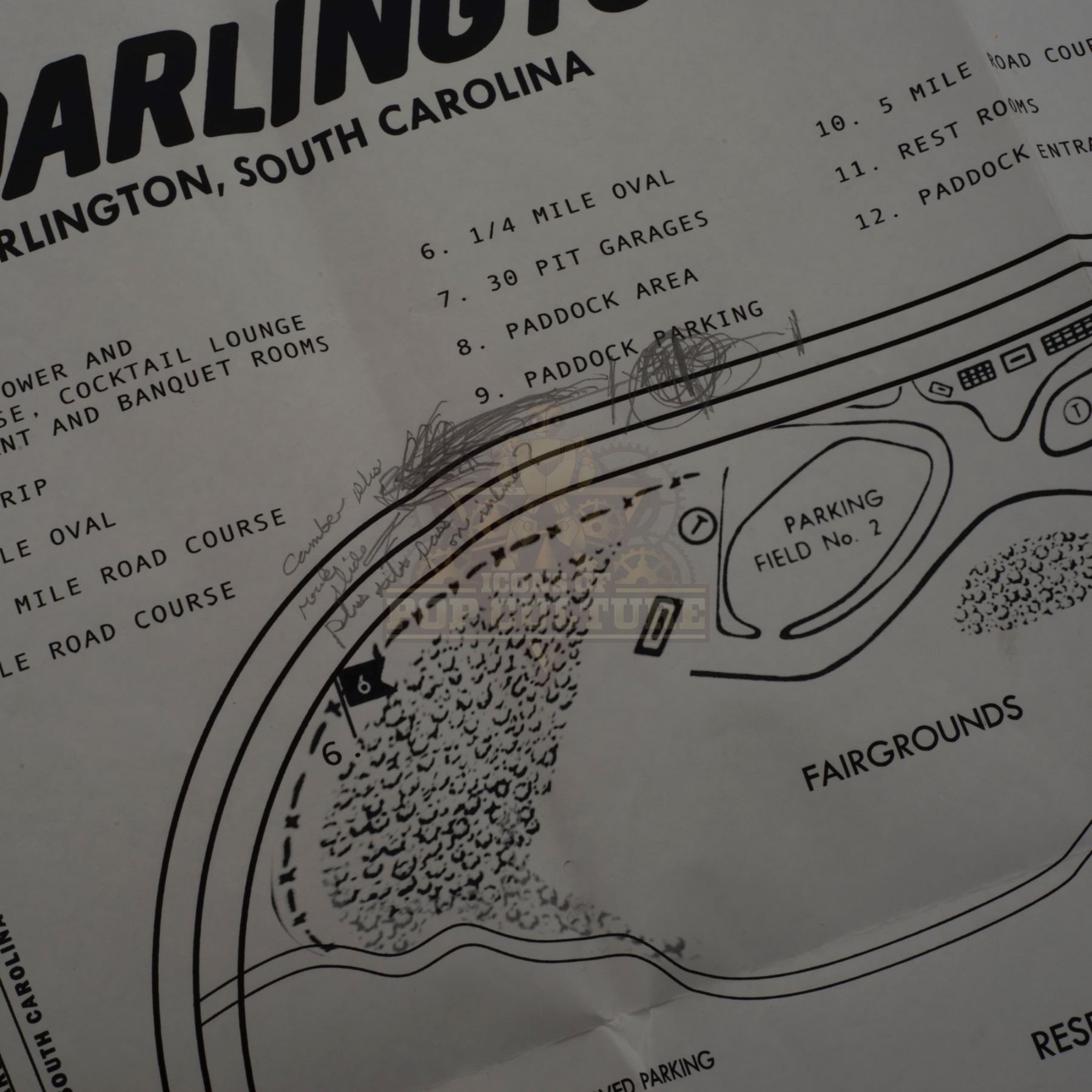 This prop map was custom printed by the production for use by Matt Long as “Ryan Millerson” in the season two episode titled “The Darlington 500”. The map measures 22” x 19” and features the complete layout of the “Darlington Raceway” track and grounds, along with some handwritten notes in pencil.