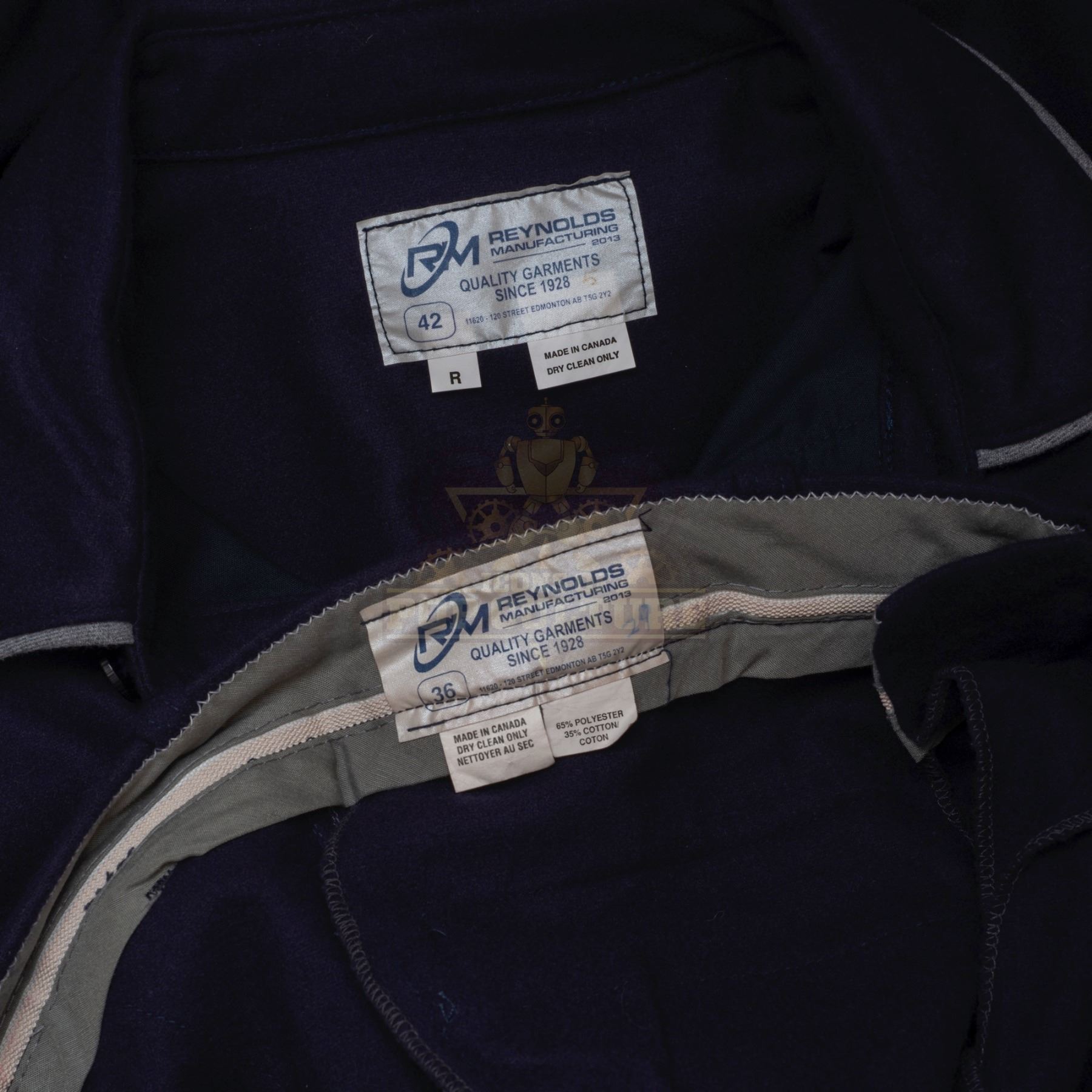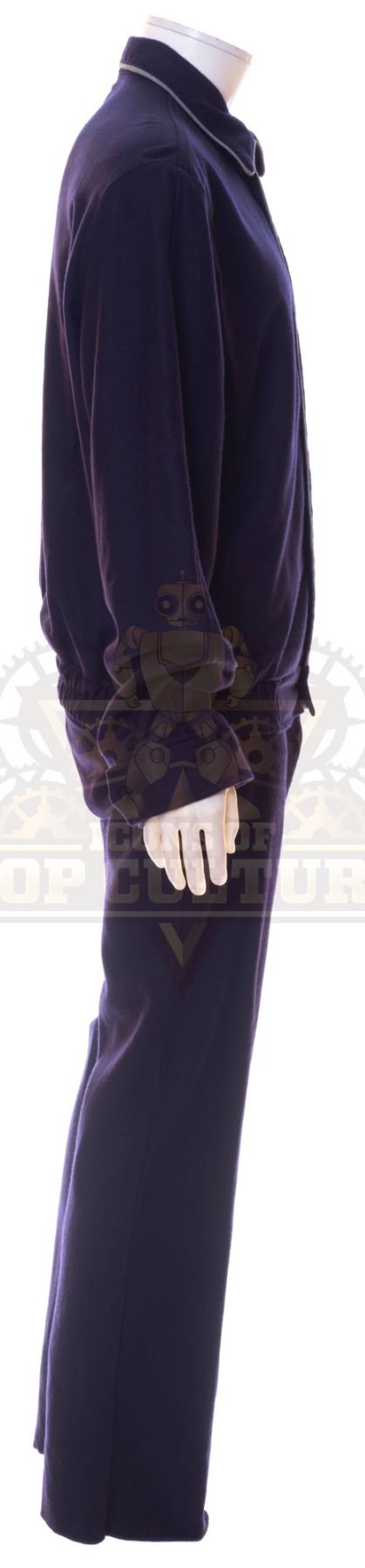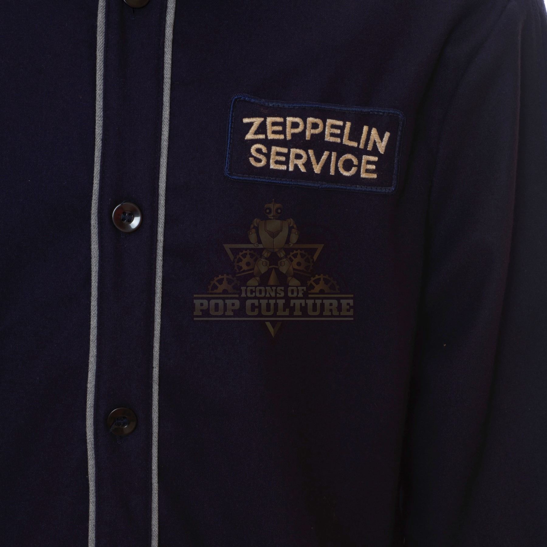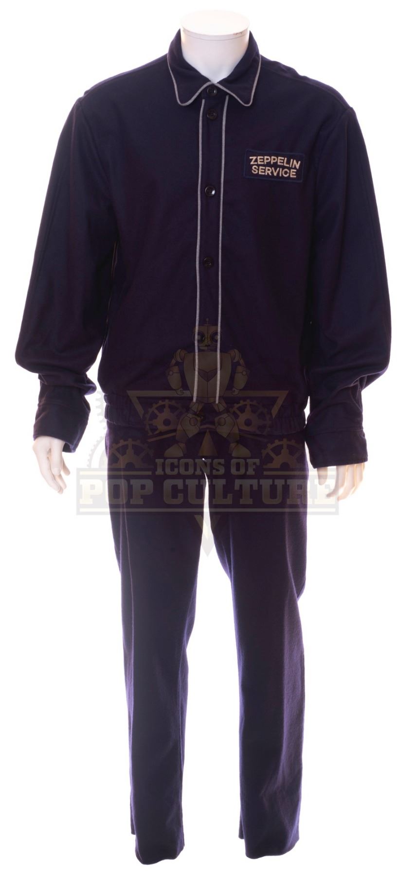 This outfit was acquired by the production for use by various actors as the “Zeppelin Service Crew” in the season one episode titled “Pilot”. The outfit consists of a dark blue button front jacket that features light blue piping and a “Zeppelin Service” patch applied to the left chest and a pair of matching pants. As the Hindenburg lands Lucy looks on as a “Zeppelin Service” crewmember can be seen helping passengers off the airship.