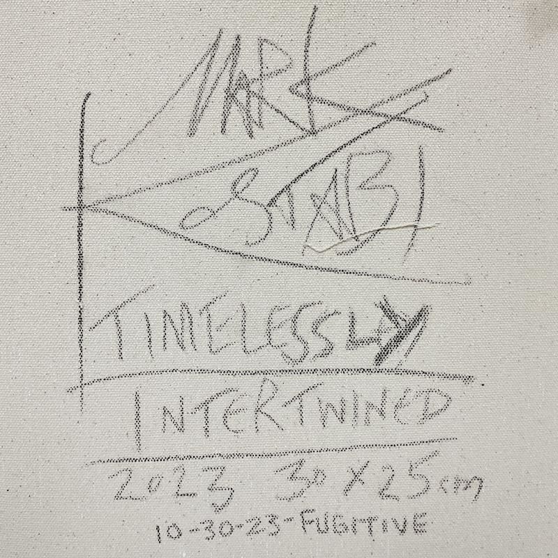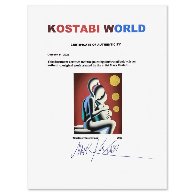 "Timelessly Intertwined" is an original oil painting on canvas by Mark Kostabi, hand signed by the artist. Includes Certificate of Authenticity. Measures approx. 12" x 10" (image).