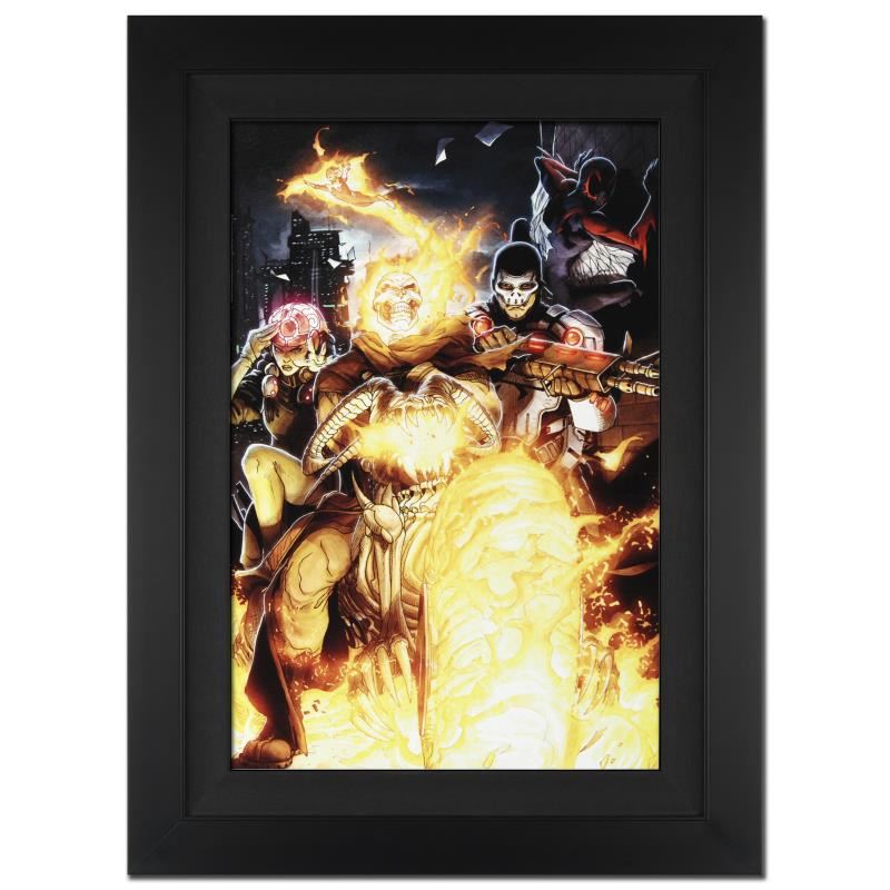 A piece of comic book history, this limited edition, from original art by Salvador Larroca, depicts Ghost Rider, punisher, Cerebra, Spider-Man and Human Torch. Salvador Larroca is a Spanish comic book artist, primarily known for his work on various X-Men titles. After several years of working as a cartographer, he began working as a comic artist at Marvel UK, the Britain-based imprint of Marvel Comics.Larroca began to work on mainstream North American comics, such as Marvel Comics' Ghost Rider, during the mid 1990s. "Timestorm 2009/2099 #2" is an extremely limited edition giclee on canvas by Salvador Larroca presented by Marvel Comics, hand signed by the great Stan Lee and numbered out of only 10! This piece is custom framed and ready to hang! Includes Certificate of Authenticity! Measures approx. 25" x 34" (with frame); 18" x 27" (image).
