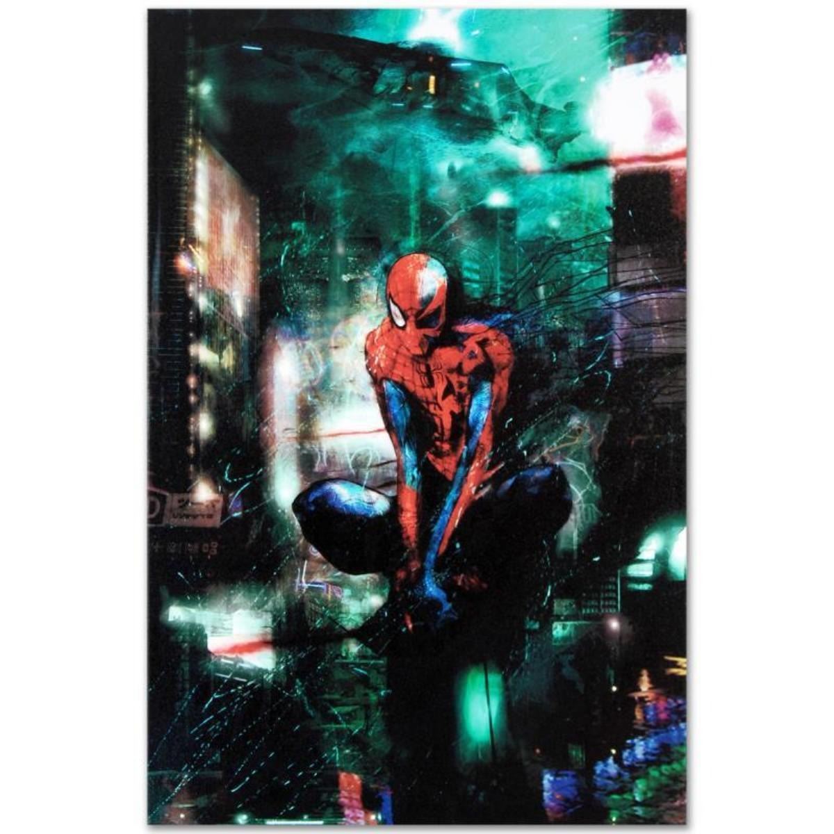 A piece of comic book history, this limited edition, from original art by Christopher Shy, depicts an epic image of Spider-Man. A freelance science fiction and fantasy artist, Christopher Shy has also drawn his own graphic novels. "Timestorm" is a limited edition numbered giclee on stretched canvas by Christopher Shy presented by Marvel Comics. This piece comes gallery wrapped. Includes Certificate of Authenticity! Measures approx. 18" x 27" (image); 1.5" (depth). This item requires special handling and may have a longer than usual turnaround.