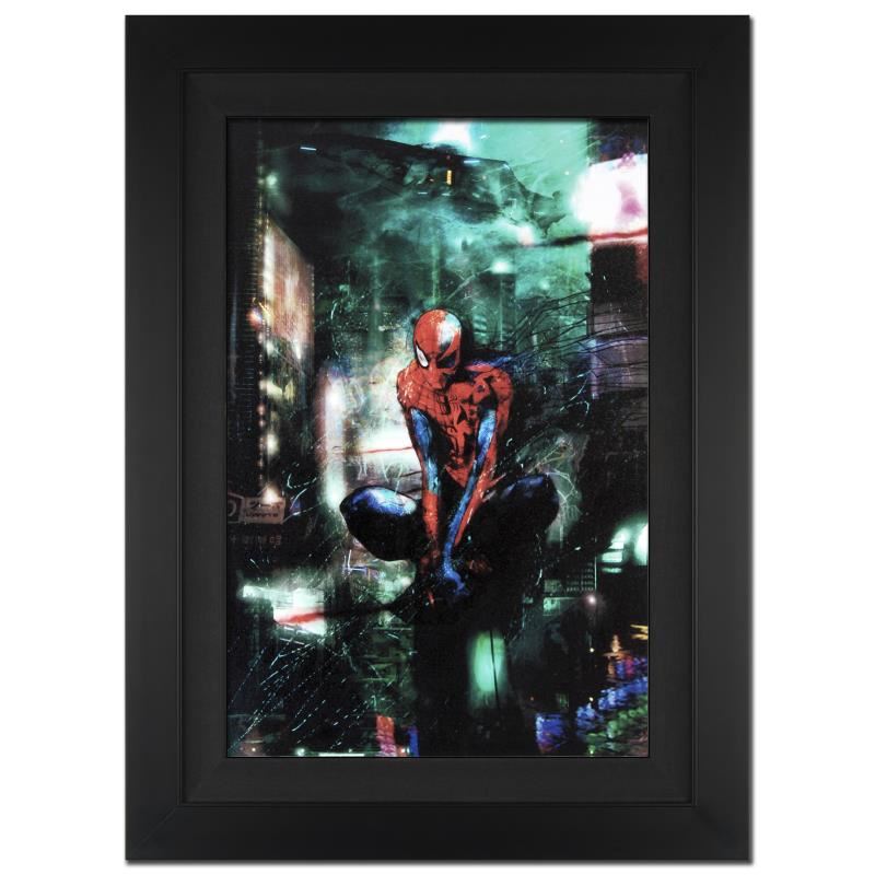 A piece of comic book history, this limited edition, from original art by Christopher Shy, depicts an epic image of Spider-Man. A freelance science fiction and fantasy artist, Christopher Shy has also drawn his own graphic novels. "Timestorm" is an extremely limited edition giclee on canvas by Christopher Shy presented by Marvel Comics, hand signed by the great Stan Lee and numbered out of only 10! This piece is custom framed and ready to hang. Includes Certificate of Authenticity! Measure approx. 25" x 34" (with frame), 18" x 27" (image). Please allow 5 additional business for items that include canvas stretch or framing.