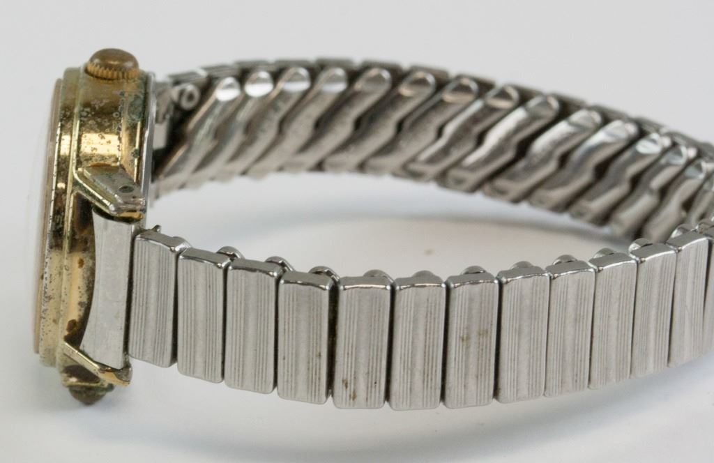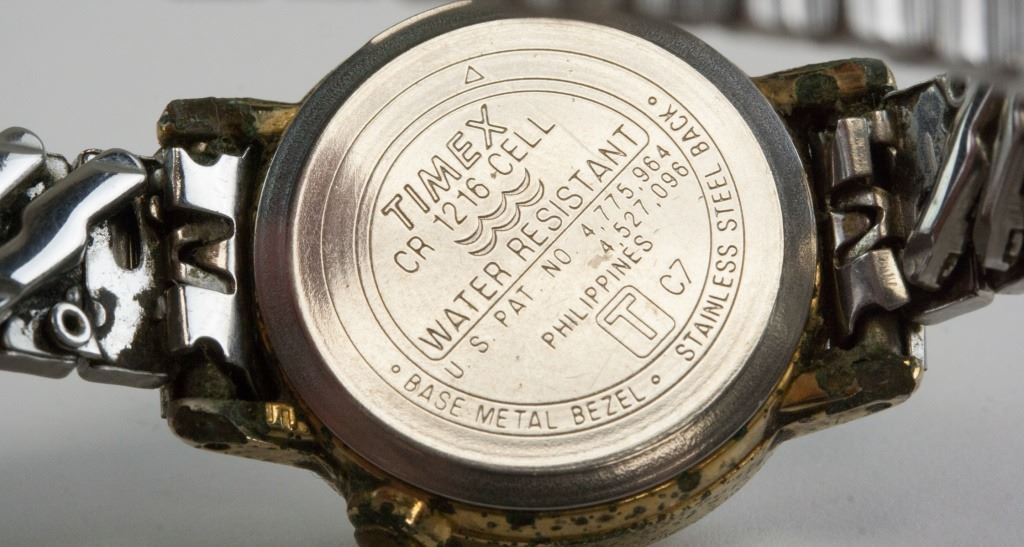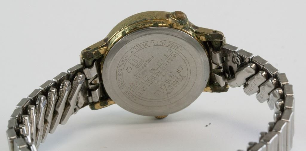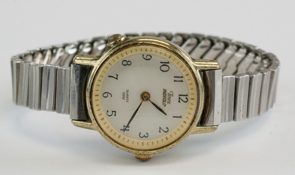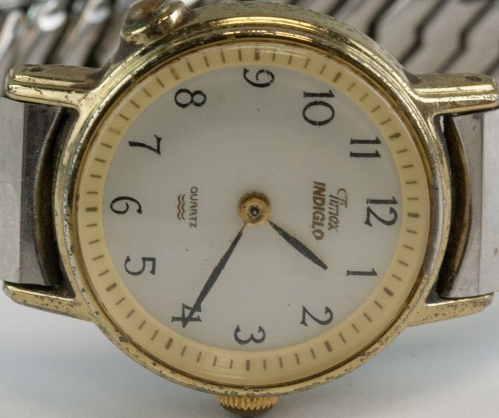 Gold- and silver-colored watch. With round watch face. "TIMEX INDIGLO" and "QUARTZ" printed on watch face. "TIMEX CR 1216 CELL / WATER RESISTANT / US PAT NO 1775964 1527096 / PHILIPPINES / BASE METAL BEZEL / STAINLESS STEEL BACK" stamped on back. Diameter: 4.3 cm, 20 grams.