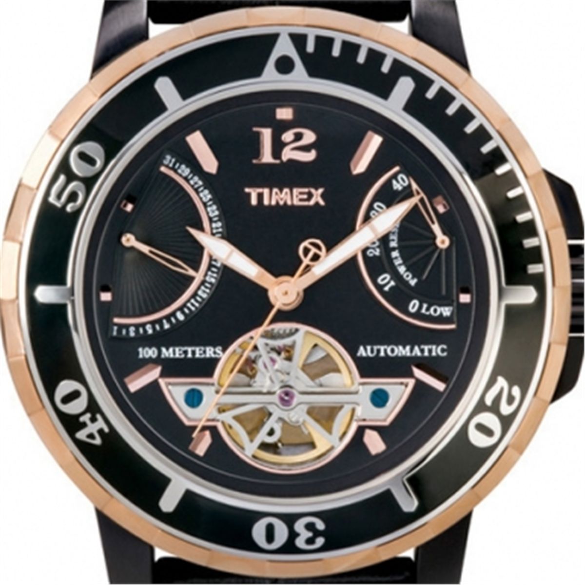 This is a Timex Mens SL Automatic Black Leather Bracelet Watch T2M931 with the following features: Stainless steel case; black leather bracelet; unidirectional rotating black enamel with rose gold bezel; black with skeletal display dial; luminous rose gold hands and stick hour markers ; Arabic numeral at the 12 o'clock position. minute markers around the outer rim; two sub-dials displaying: date and 40 hour power reserve; Automatic movement; Screw down crown; Skeletal case back; Tang clasp; Water resistant at 100 meters / 330 feet.