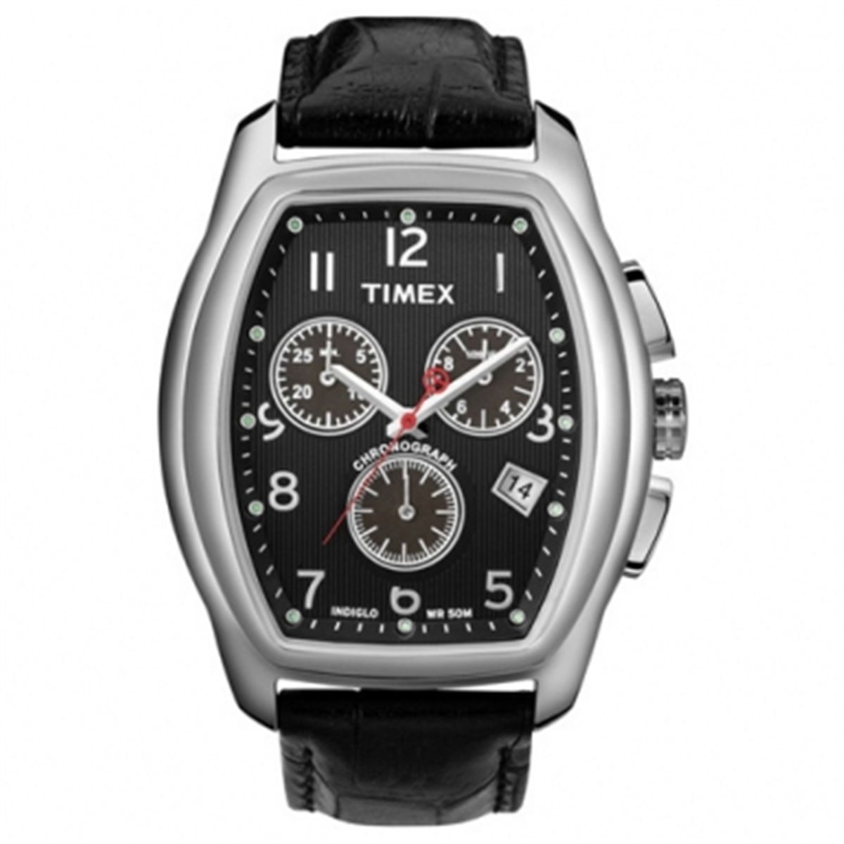 This is a Timex T Series Mens Chronograph Black Leather Strap Watch with the following features: Analog display; Quartz movement; Stainless steel case; Black leather band with buckle clasp; Date feature; Chronograph functions; Black dial; and Water resistant.