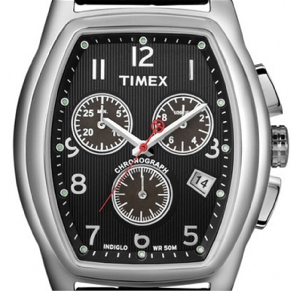 This is a Timex T Series Mens Chronograph Black Leather Strap Watch with the following features: Analog display; Quartz movement; Stainless steel case; Black leather band with buckle clasp; Date feature; Chronograph functions; Black dial; and Water resistant.