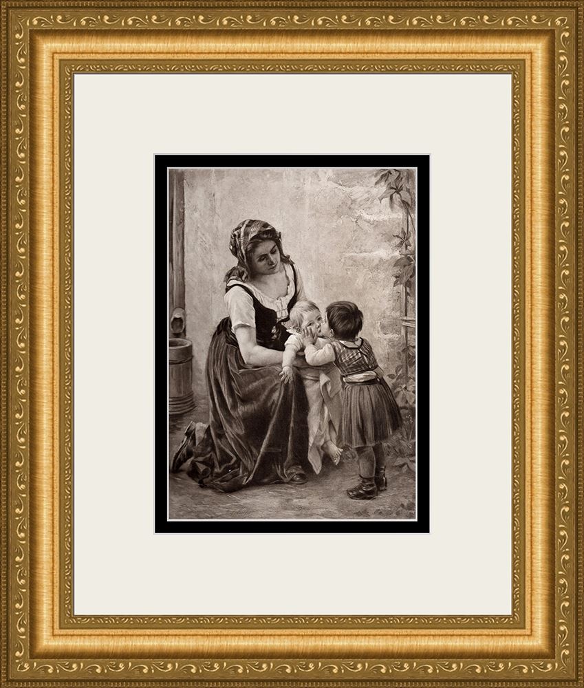 Antique heliogravure on heavy wove paper after Timoléon Marie Lobrichon. "Neighbors" A mother introducing her baby to the neighbor child. This impression is well more than 120 years old. This is not a modern reprint but was hand pulled from the copper plate late 1880's. Image size 7 x 9 3/4 inches. Double matted and framed in a solid wood moulding. Frame dimensions c. 15 x 17 3/4 inches. This print is in excellent condition. Comes with a Certificate of Authenticity.