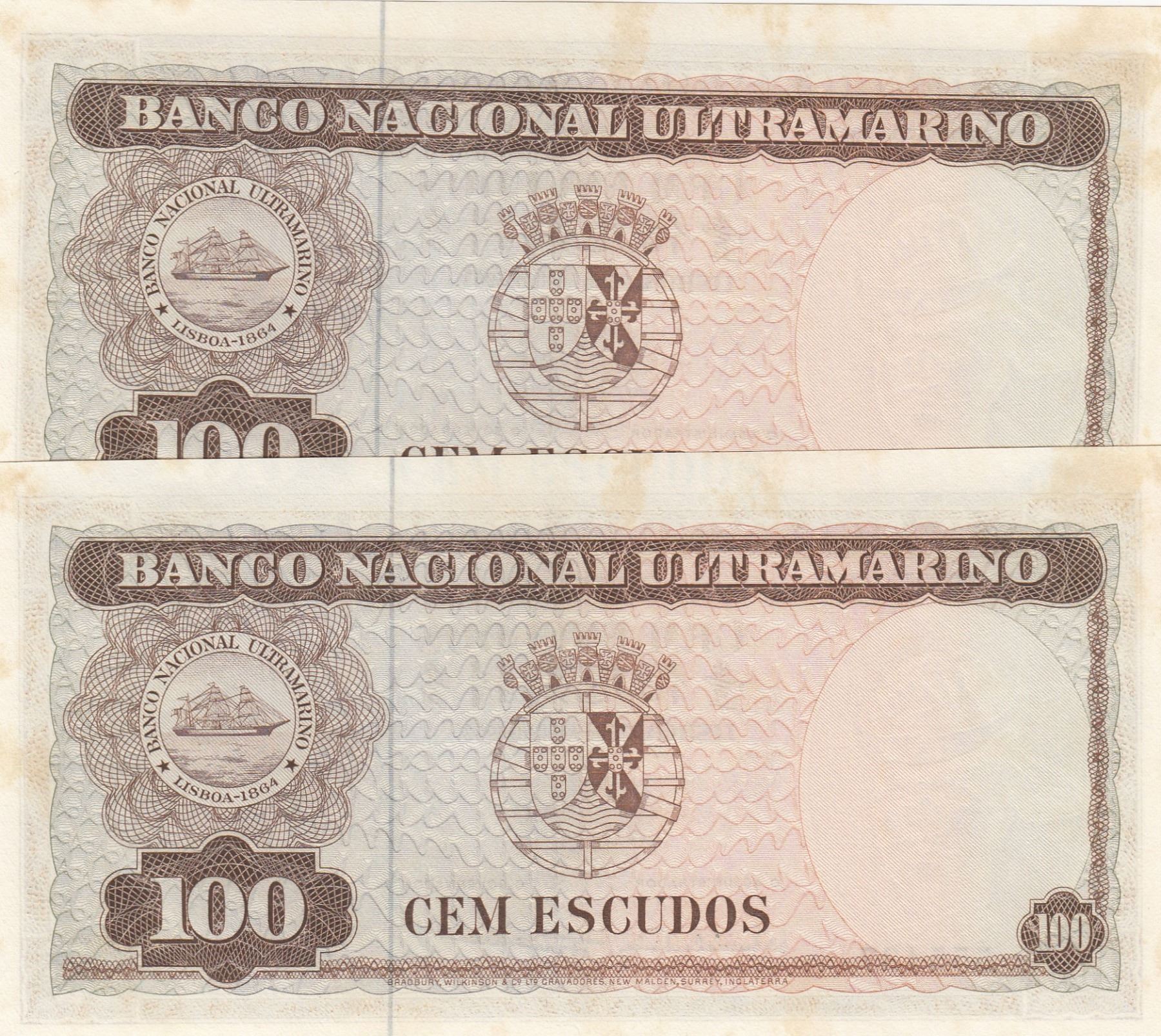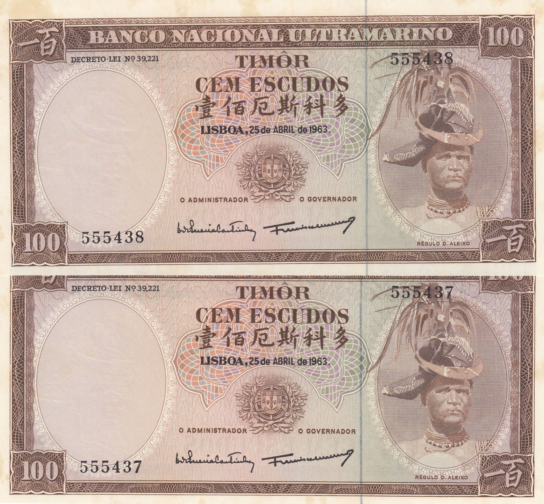 Timor, 100 Escudos, 1963, UNC, p28, (Total 2 consecutive banknotes)br/serial numbers: 555437-8