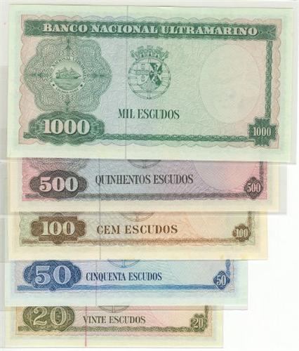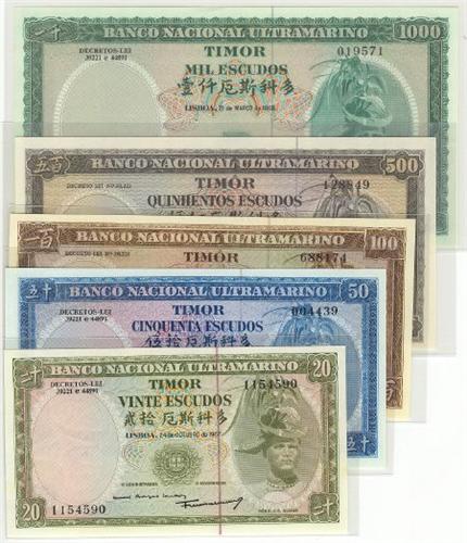 Timor, issue of 1963-68, 20, 50, 100, 500, 1000 escudos, all UNC, Pick number 26, 27, 28, 29, 30.