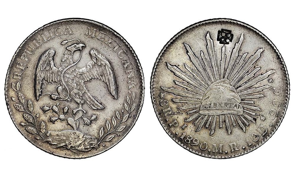 Carimbo cruz potentada sobre 8 Reales 1890 (KM 377.12) San Luis Potosi MBC