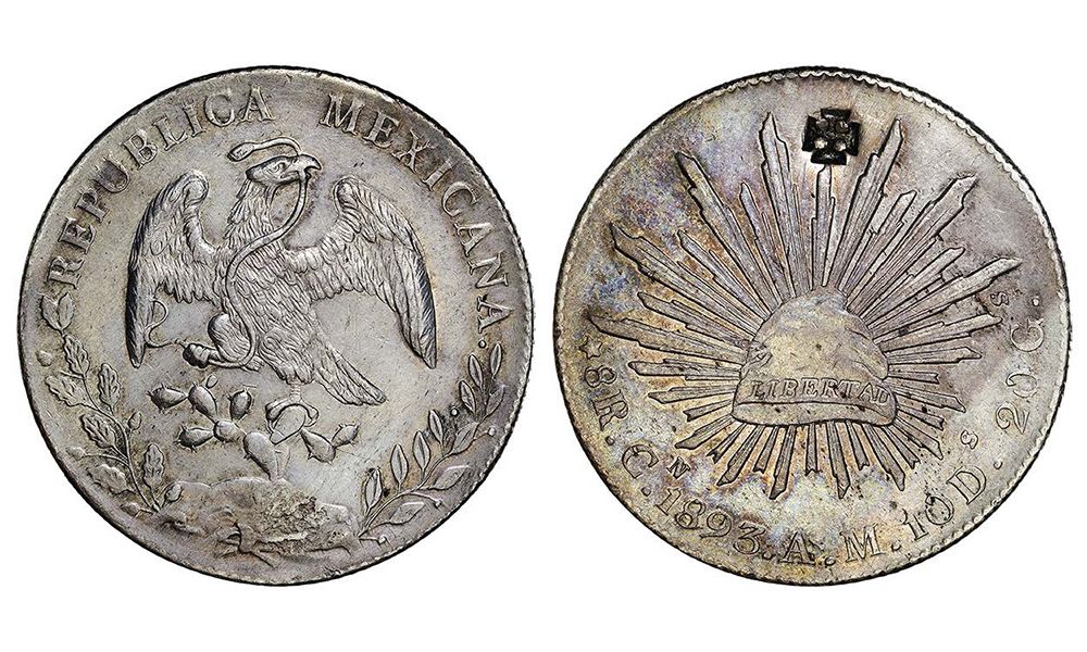Carimbo cruz potentada sobre 8 Reales 1893 (KM 377.3) Culiacan MBC