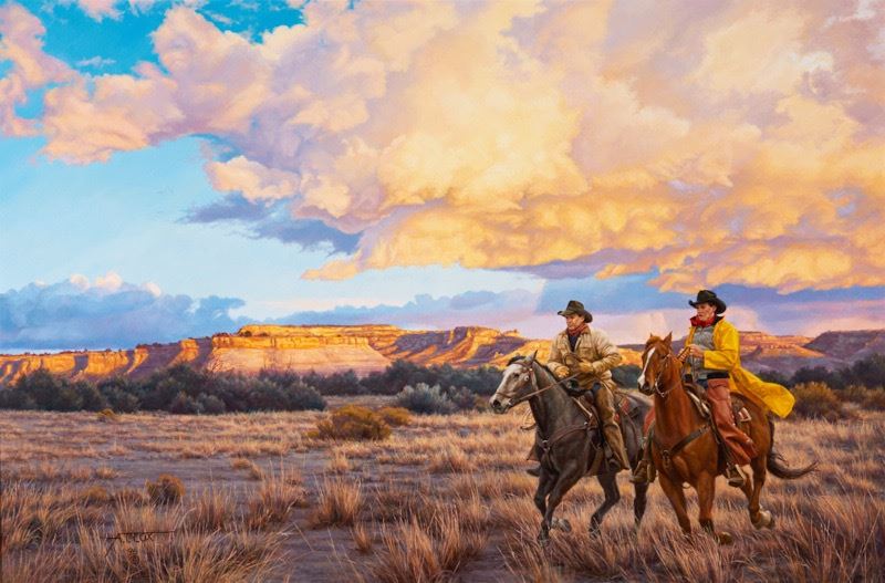 To the unaided eye, this piece appears to be in very good condition. Inspection under ultraviolet light reveals a normal fluorescence of the artist's pigments. There are a couple subtle inconsistencies in the varnish near the right hand figure. There are no signs of damage or restoration. The piece is framed in a pale, carved rustic wooden frame with a gold liner. The frame is also in very good condition. Plate: Racing Sundown, By Tim Cox