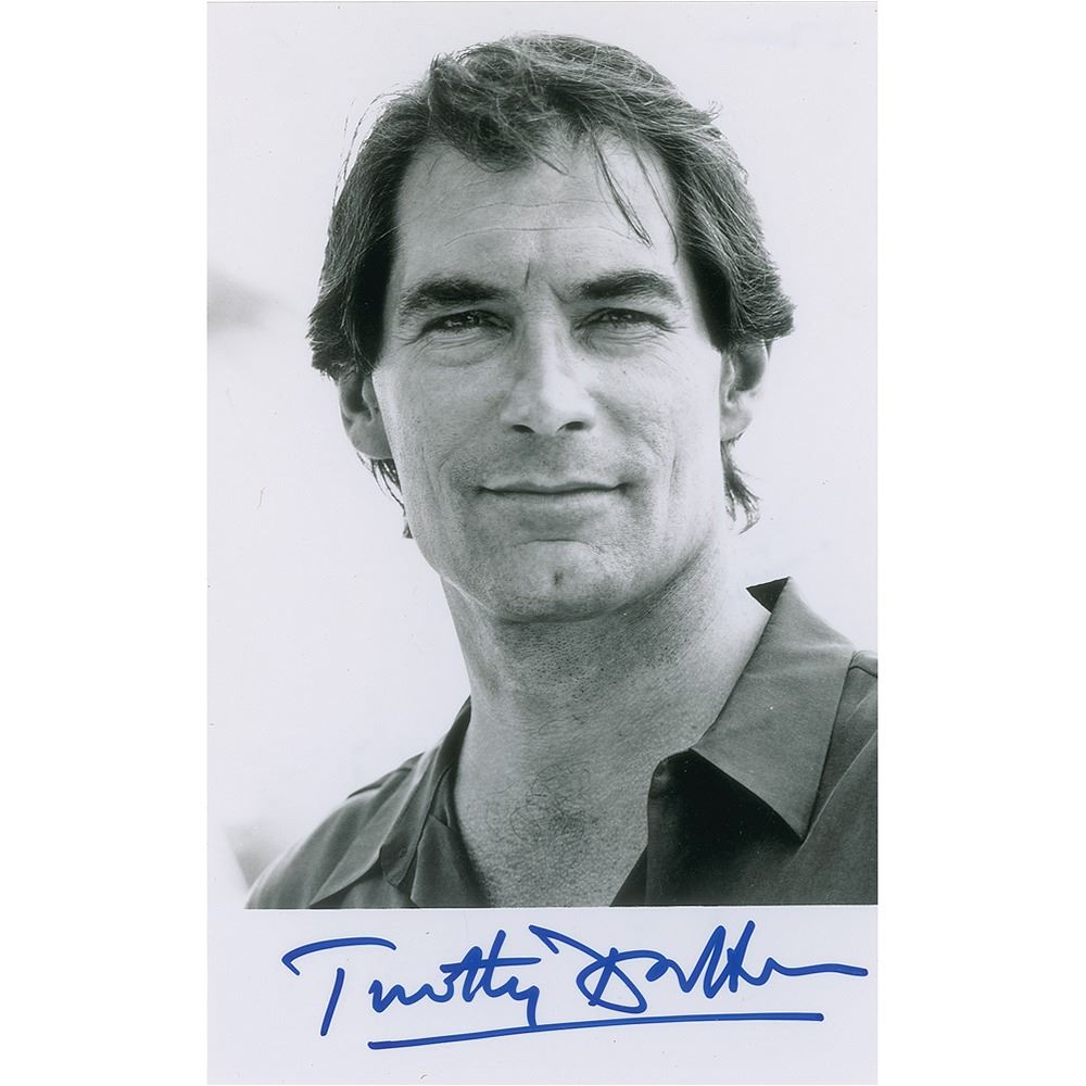 Glossy 5 x 8 photo of Timothy Dalton in a casual pose, signed in the lower border in blue felt tip. In fine condition.