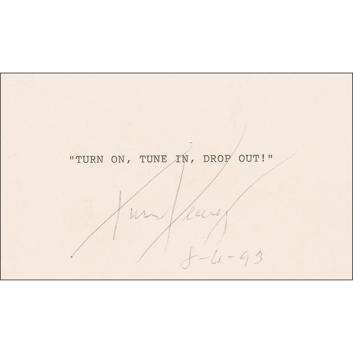 TQS on a 5 x 3 card, signed at the bottom in blue ink, “Timothy Leary, 8-6-93.” In full, “Turn On, Tune In, Drop Out!” In fine condition, with signature a shade light.