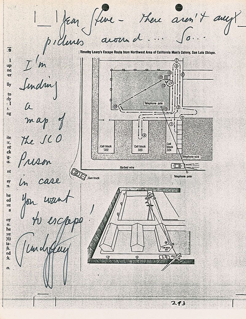 ALS, on a photocopied map of his escape route from the California Men’s Colony, 8.5 x 11, no date. Leary writes: “There aren’t any pictures around…So I’m sending a map of SLO Prison in case you want to escape!” In fine condition.