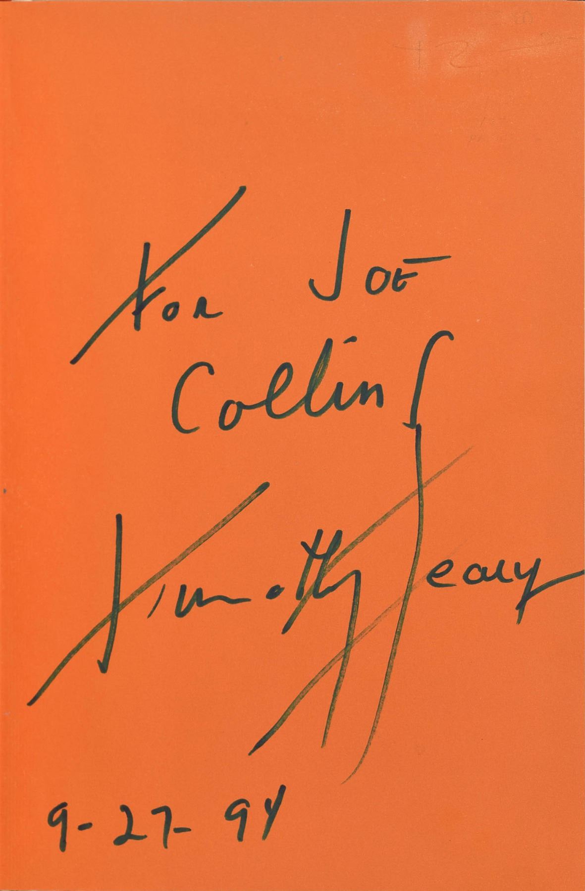 Two first edition books, both hardcovers with dust jackets: Flashbacks, published in 1983 by J. P. Tarcher, signed and inscribed on the first free end page in felt tip, "To Joe, with respect and affection, Timothy Leary, 5-90"; and Jail Notes, published in 1970 by Douglas, signed and inscribed on the first free end page in felt tip, "For Joe Collins, Timothy Leary, 9-27-94." In overall fine condition.
