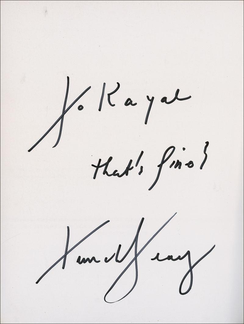 Signed book: Chaos & Cyber Culture. First edition, first printing. California: Ronin Publishing, 1994. Softcover, 8.5 x 11, 272 pages. Signed and inscribed on the inside front cover, “To Kayal, That’s fine, Timothy Leary.” Scattered creasing and edge wear to covers, and light overall handling wear, otherwise fine condition. RRAuction COA.