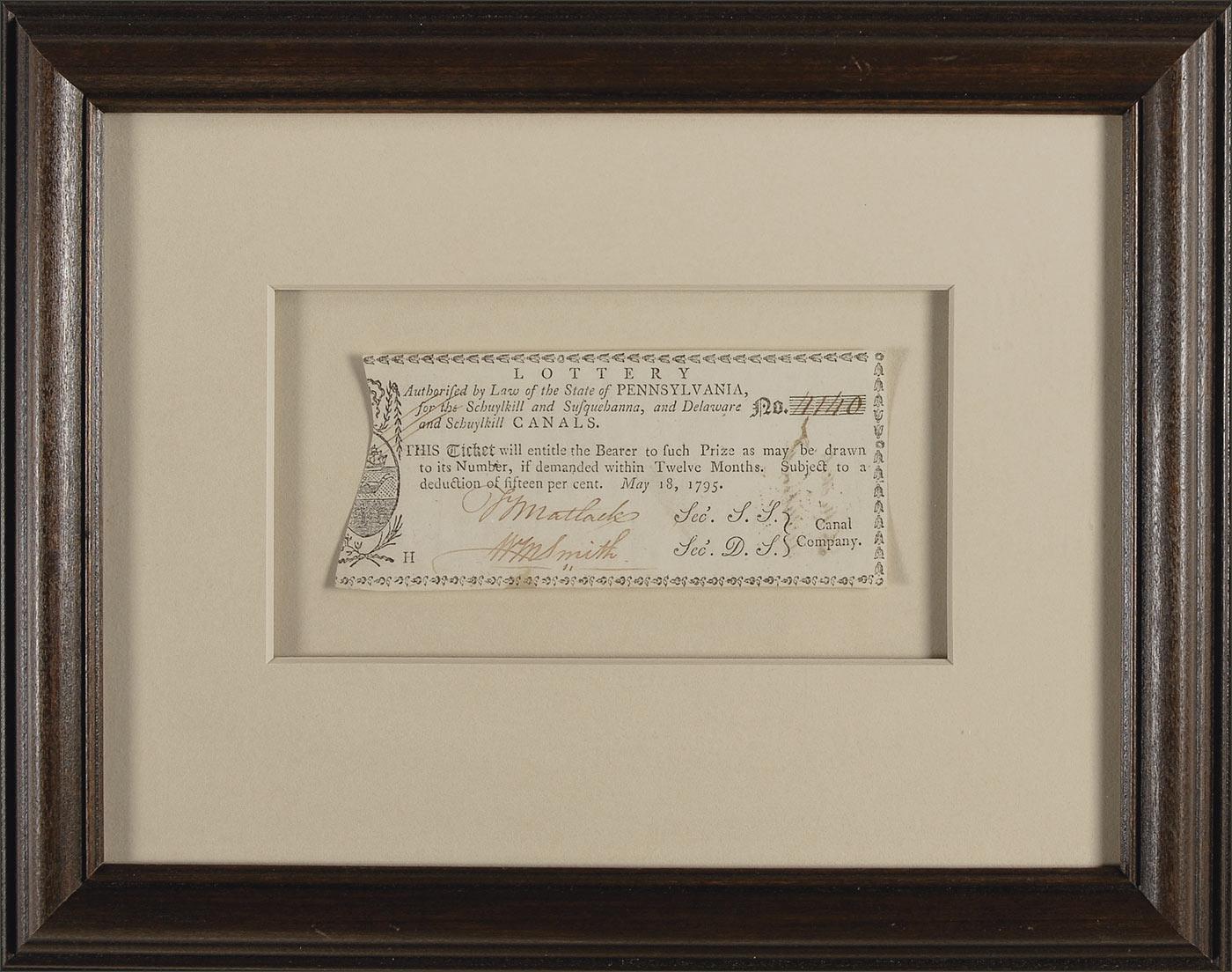 American merchant, surveyor, architect, statesman, and patriot in the American Revolution (1730–1829). As clerk to the Secretary of the Continental Congress, Matlack actually ‘wrote’ the Declaration of Independence. Printed 5.75 x 2.75 lottery ticket, dated May 18, 1795, completed in manuscript. An early American lottery ticket issued by the state of Pennsylvania to help fund the “Schuylkill and Susquehanna, and Delaware and Schuylkill canals.” Signed at the bottom, “T. Matlack,” and also signed “Wm. Smith.” Matted and framed to an overall size of 13 x 10. In fine condition, with a bit of light toning, and some show-through from notation on reverse.