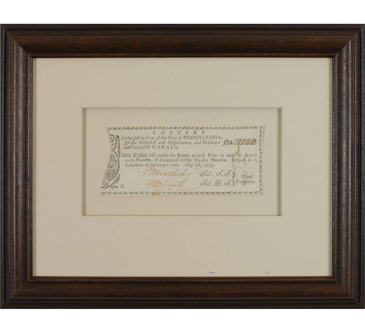 American merchant, surveyor, architect, statesman, and patriot in the American Revolution (1730–1829). As clerk to the secretary of the Continental Congress, Matlack actually ‘wrote’ the Declaration of Independence. Printed 5.75 x 2.75 lottery ticket, dated May 18, 1795, completed in manuscript, issued by the state of Pennsylvania to help fund the “Schuylkill and Susquehanna, and Delaware and Schuylkill canals.” Signed at the bottom, “T. Matlack,” and also signed “Wm. Smith.” Matted and framed to an overall size of 13 x 10. In fine condition, with a bit of light toning, and some show-through from notation on reverse.