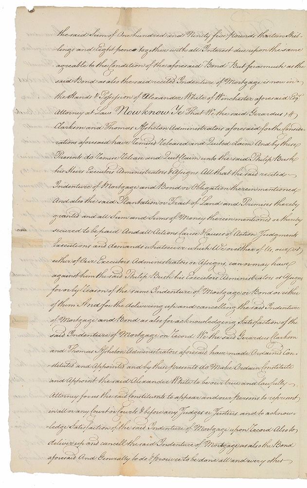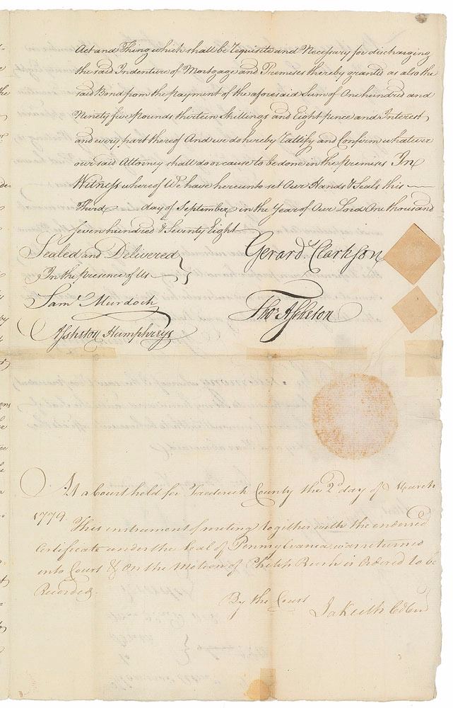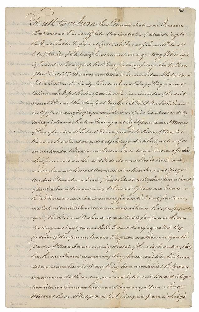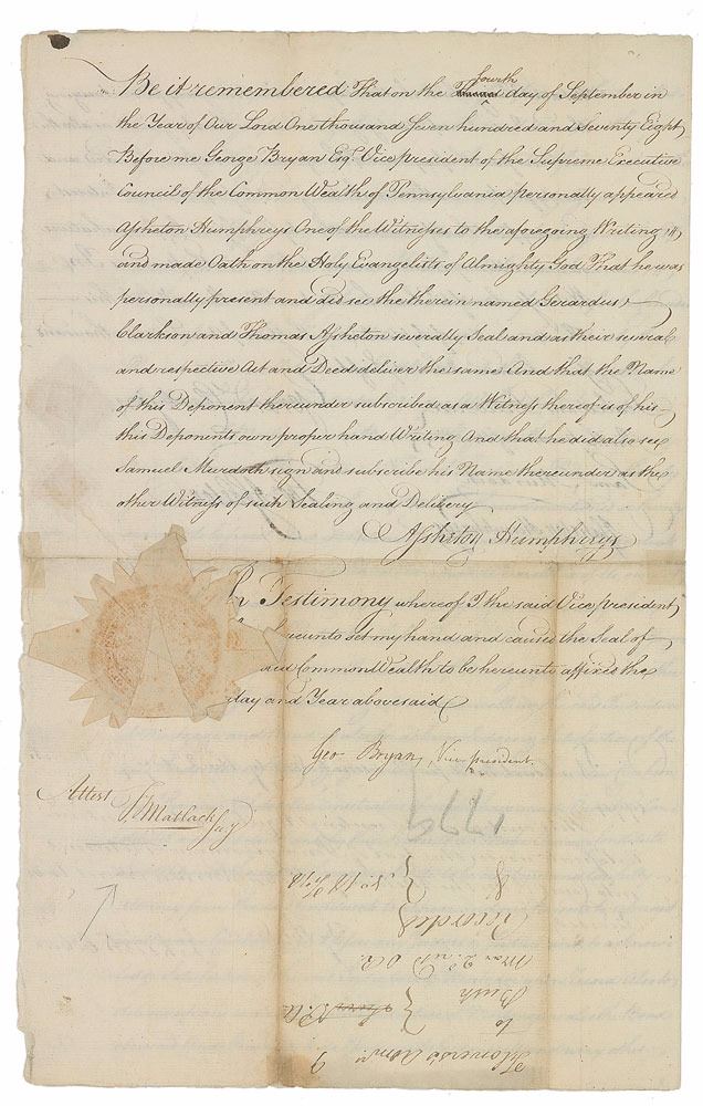Political leader from Pennsylvania best known for engrossing the Declaration of Independence on parchment (1736–1829). Revolutionary War-dated manuscript DS, signed "Attest T. Matlack Sec'y," four pages on two adjoining sheets, 8.25 x 13, September 3, 1778. Lengthy indenture concerning "a certain Plantation or Tract of Land Situate on Stephen's Run a branch of Crooked Run in the said County of Frederick." Signed at the conclusion below the affixed white paper seal by Matlack as secretary of the Supreme Executive Council of Pennsylvania. Intersecting folds with repaired partial separations and light soiling, otherwise fine condition. Accompanied by a complete typed transcript of the lengthy document.