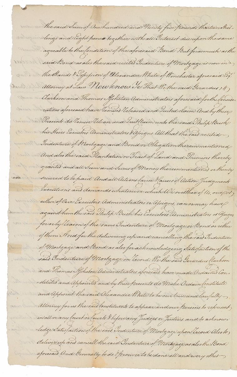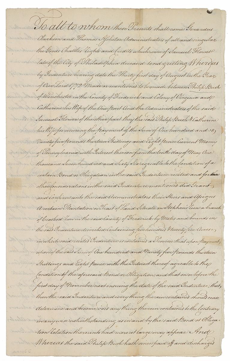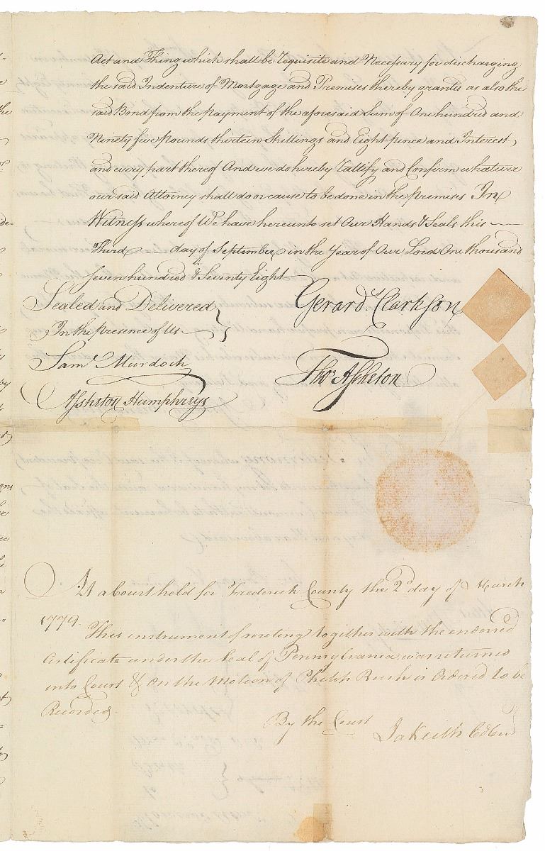 Political leader from Pennsylvania best known for engrossing the Declaration of Independence on parchment (1736–1829). Revolutionary War–dated manuscript DS, signed “Attest T. Matlack Sec’y,” four pages on two adjoining sheets, 8.25 x 13, September 3, 1778. Lengthy indenture concerning “a certain Plantation or Tract of Land Situate on Stephen’s Run a branch of Crooked Run in the said County of Frederick.” Signed at the conclusion below the affixed white paper seal by Matlack as secretary of the Supreme Executive Council of Pennsylvania. Intersecting folds with repaired partial separations and light soiling, otherwise fine condition. Accompanied by a complete typed transcript of the lengthy document.