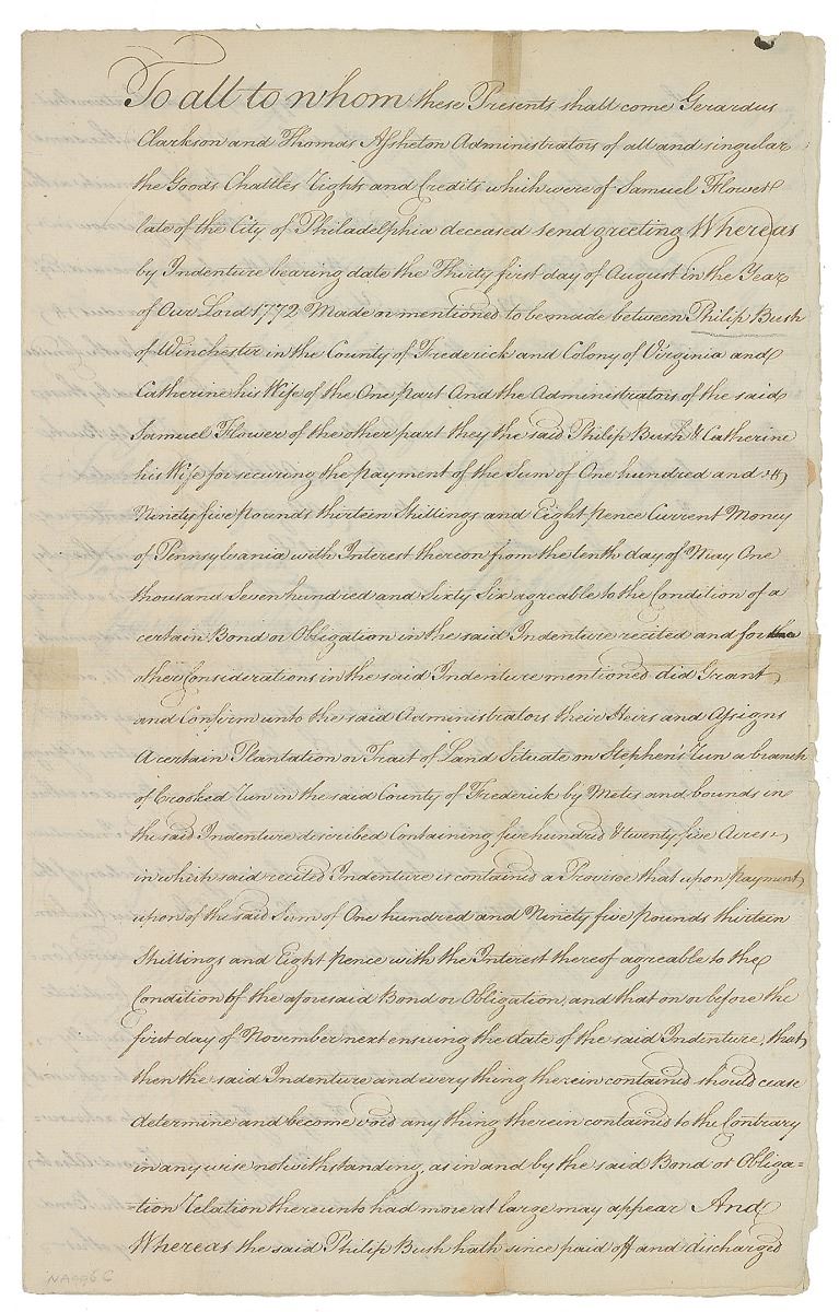 Political leader from Pennsylvania best known for engrossing the Declaration of Independence on parchment (1736–1829). Revolutionary War–dated manuscript DS, signed “Attest T. Matlack Sec’y,” four pages on two adjoining sheets, 8.25 x 13, September 3, 1778. Lengthy indenture concerning “a certain Plantation or Tract of Land Situate on Stephen’s Run a branch of Crooked Run in the said County of Frederick.” Signed at the conclusion below the affixed white paper seal by Matlack as secretary of the Supreme Executive Council of Pennsylvania. Intersecting folds with repaired partial separations and light soiling, otherwise fine condition. Accompanied by a complete typed transcript of the lengthy document.