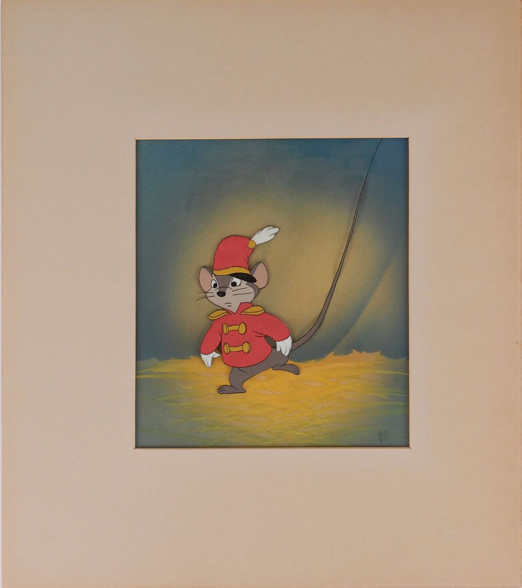 (Walt Disney Studios, 1941) Original production cel featuring Timothy Mouse from Dumbo, showing him wearing his red circus uniform. The cel has been trimmed and applied to an airbrushed background as prepared by Courvoisier Galleries for sale. Image measures 4 x 6, with a mat opening of 7 x 8. Mat dimensions are 13.25 x 15. Reverse bears a Walt Disney Productions copyright stamp and a gift inscription. In fine condition.