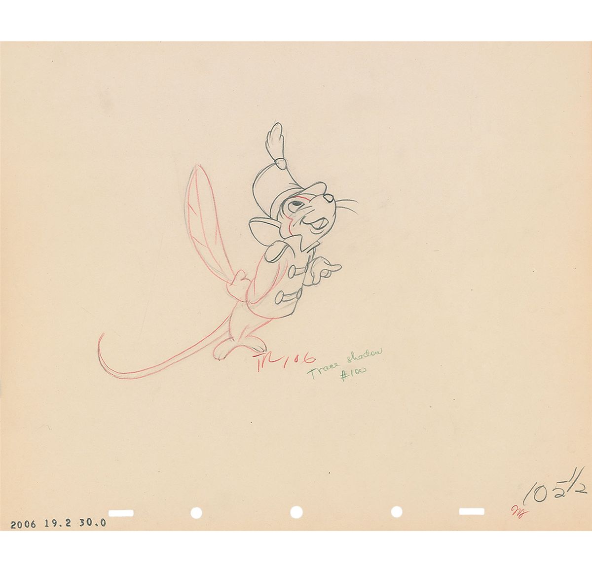 (Walt Disney Studios, 1941) Original production drawing featuring Timothy Mouse from Dumbo. Accomplished in red pencil and graphite on untrimmed 12 x 10 animation paper. Image measures 5.25 x 4.75 and shows Timothy Mouse with Dumbo’s ‘magic feather’ behind his back. In fine condition.