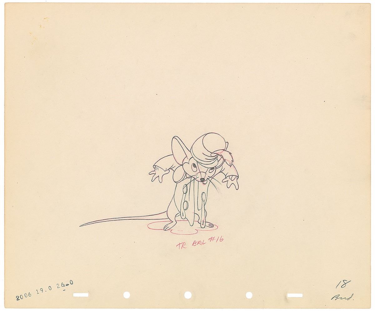(Walt Disney Studios, 1941) Great original production drawing featuring Timothy Mouse from Dumbo, depicting the courageous rodent after an impromptu soaking. Accomplished in graphite and colored pencil on untrimmed 12 x 10 animation paper. Image measures 5.25 x 3.25. In fine condition.