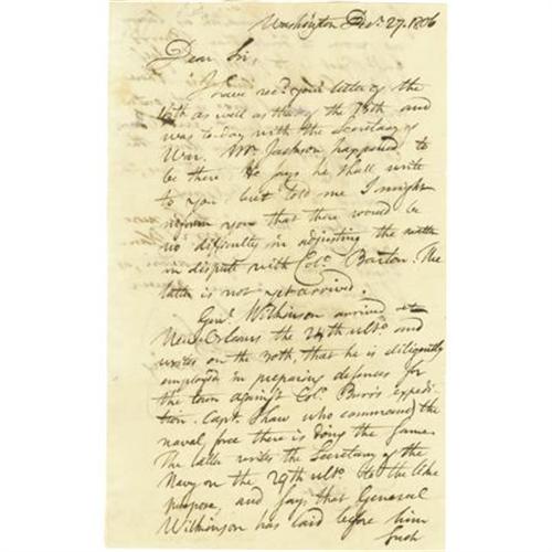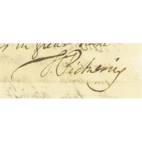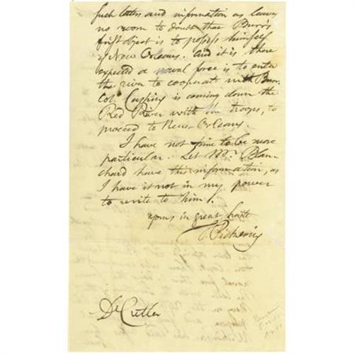 <B>Timothy Pickering Autograph Letter Signed, "</B></I><I>T. Pickering" </B></I>as Senator from Massachusetts, one page, 7.5" x 12.75", Washington, December 27, 1806 to Dr. Cutler. This letter contains significant content reporting upon Wilkinson's exposure of the Aaron Burr conspiracy and preparations to defend New Orleans. He writes, in part: "<I>Genl. Wilkinson arrived at New Orleans the 24th...and writes on the 30th, that he is diligently employed in preparing defenses for the town against Colo. </B></I> Aaron <I>Burr's expedition. Capt. Shaw who commands the naval force there is doing the same. The latter writes the Secretary of the navy on the 29th ulto. to the like purpose, and says that General Wilkinson has laid before him such letters and information as leaves no room to doubt that Burr's first object is to possess himself of New Orleans. And it is there expected a naval force is to enter the river to cooperate with Burr. Colo. Cushing is coming down the Red River with the troops, to proceed to New-Orleans...</B></I>" Wilkinson, Governor of Louisiana, disclosed Burr's plan to establish a southwestern empire and was later the chief witness at Burr's trial for treason in 1807. However he was also a central player in the conspiracy itself, and it was only when he realized the plot was destined to fail that he betrayed his long-time friend and comrade-in-arms. Wilkinson's involvement with the plot made him subject to a court martial in 1811, from which he was acquitted. Pickering was a Quartermaster-General during the American Revolution and also Secretary of War under Washington and Secretary of State under Washington and Adams. Ironically, Pickering was himself a proponent of the secession of the New England States, a movement, that when exposed at the end of the War of 1812, signaled the final demise of the Federalist Party. Weak folds and ink erosion expertly repaired with tissue on second page, very light toning, else very good condition with a nice dark holograph. <I>Ex. Henry E. Luhrs Collection</B></I><BR><BR><b>Shipping:</b> Flat Material, Small (<a target="_blank" href="http://www.heritageauctions.com/common/shipping.php">view shipping information</a>)