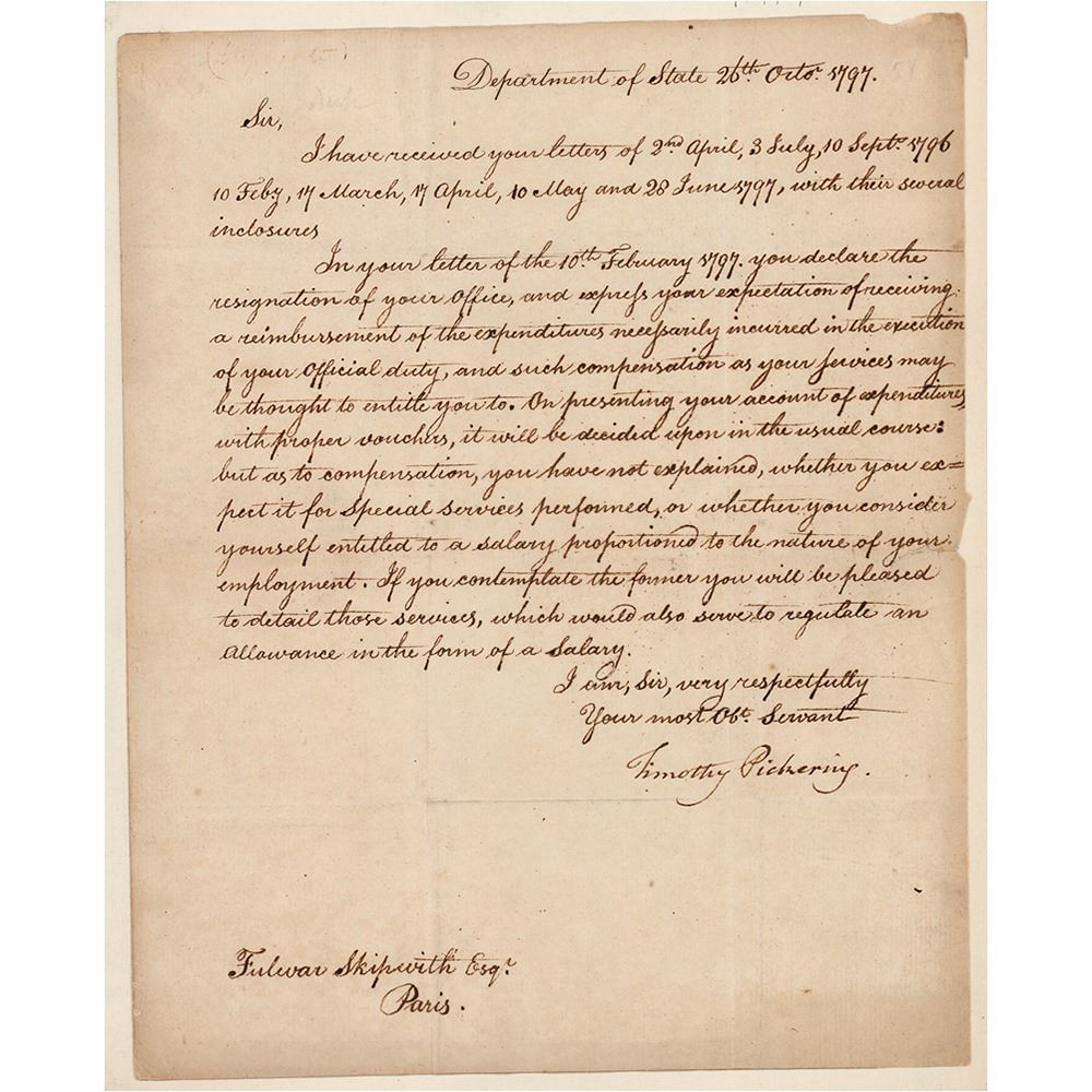 ALS as Secretary of State, one page, 8 x 10, October 26, 1797. Handwritten letter to Fulwar Skipwith, who had recently resigned from his post as the Consul-General in Paris, in full: “I have received your letters of 2nd April, 3 July, 10 Sept 1796, 10 Feby, 17 March, 17 April, 10 May and 28 June 1797, with their several inclosures. In your letter of the 10th February 1797, you declare the resignation of your office, and express your expectation of receiving a reimbursement of the expenditures necessarily incurred in the execution of your official duty, and such compensation as your services may be thought to entitle you to. On presenting your account of expenditures, with proper vouchers, it will be decided upon in the usual course: but as to compensation, you have not explained, whether you expect it for Special Services performed, or whether you consider yourself entitled to a salary proportioned to the nature of your employment. If you contemplate the former you will be pleased to detail those services, which would also serve to regulate an allowance in the form of a salary.” In fine condition, with seal-related paper loss to the integral address leaf. Accompanied by an engraving of Pickering bearing a facsimile signature.