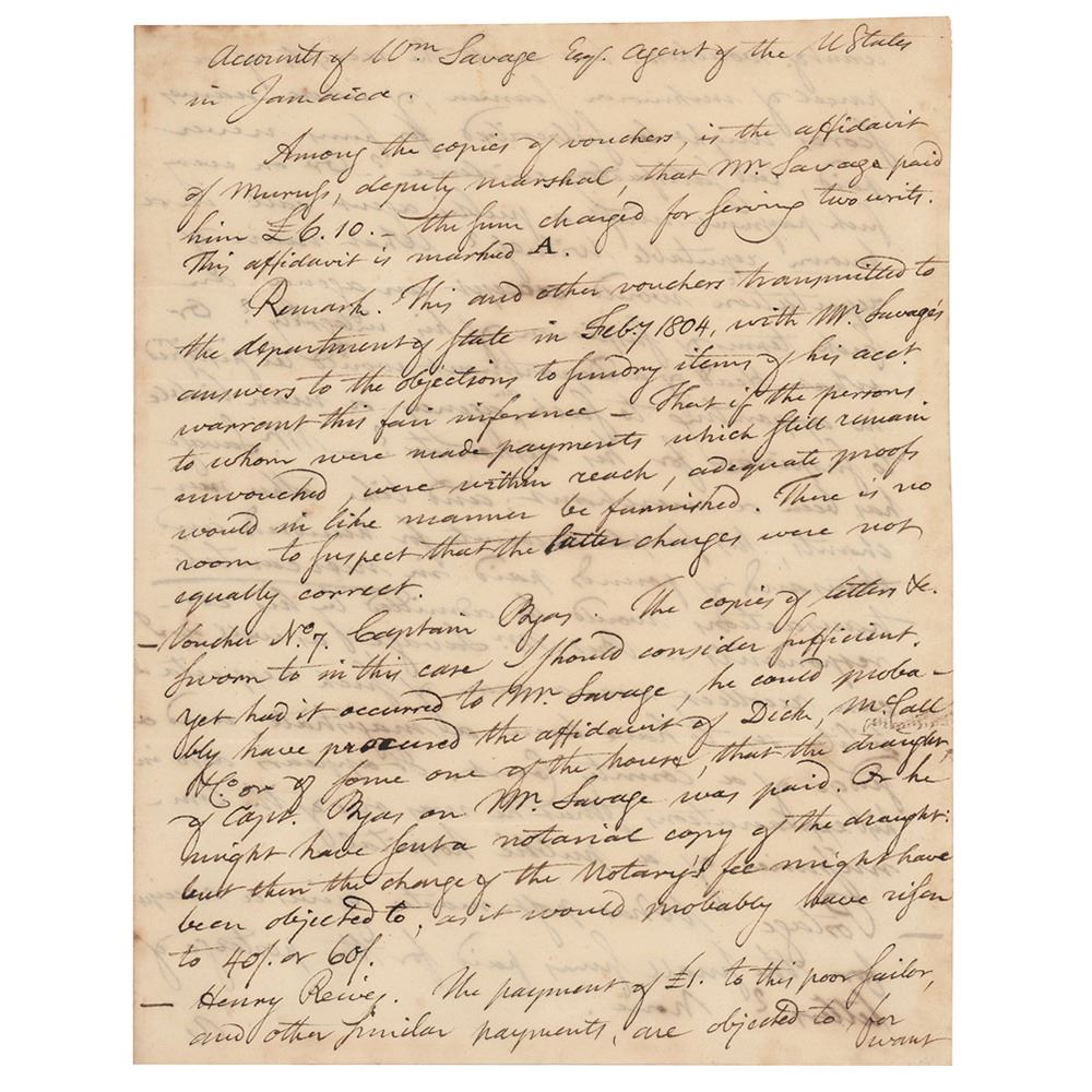 ALS signed “T. Pickering,†four pages on two adjoining sheets, 7.5 x 9.75, December 26, 1805. Handwritten letter to "Mr.Nelson," concerning the "Accounts of Wm. Savage Esq. Agent of the U. States in Jamaica." In part: "Among the copies of vouchers in the affidavit of Muruss, deputy marshal, that Mr. Savage paid him £6.10—the sum charged for serving two writs…This and other vouchers transmitted to the department of state in Feb'y 1804, with Mr. Savage's answers to the objections to sundry items of his acct. warrant this fair inference—That if the persons to whom were made payments which still remain unvouched, were within reach, adequate proofs would in like manned be furnished. There is no room to suspect that the latter charges were not equally correct." He goes on to discuss various charges in detail. In fine condition, with staining along the edges.