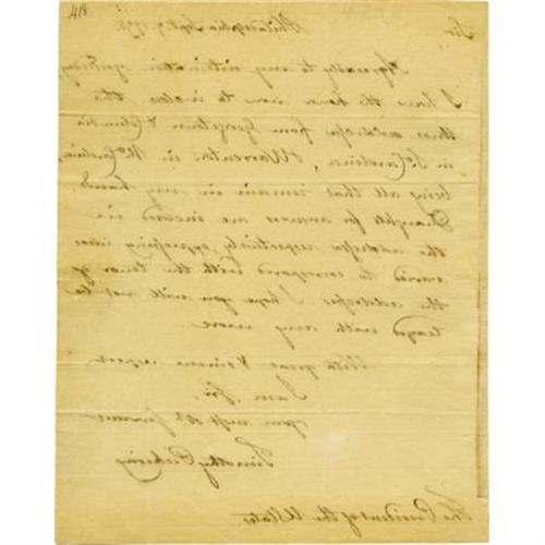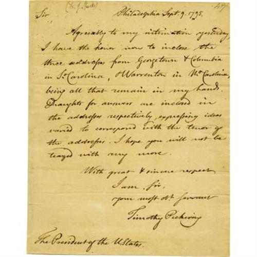 <B>Timothy Pickering Autograph Letter Signed</B></I> <I>"Timothy Pickering"</B></I> to <I>"The President of the U. States,"</B></I> one page, 7.75" x 9.75". Philadelphia, September 9, 1795. In full, <I>"Agreeably to my intimation yesterday, I have the honor now to inclose the three addresses from Georgetown & Columbia in So. Carolina, & Warrenton in No. Carolina, being all that remain in my hands. Draughts for answers are inclosed in the addresses respectively, expressing ideas varied to correspond with the tenor of the three addresses. I hope you will not be teazed sic, </B></I>teased, meaning annoyed<I> with any more. With great & sincere respect."</B></I> The <I>"three addresses"</B></I> concerned opposition to Jay's Treaty of 1794 with Great Britain. At the time, Timothy Pickering was Washington's Secretary of War. A scandal involving an intercepted French message led to Secretary of State Edmund Randolph's resignation on August 20, 1795. Pickering served as Secretary of War and acting Secretary of State from then until his appointment as Secretary of State on December 10, 1795. <BR><BR>President Washington had left Philadelphia on the morning of September 8th, shortly after speaking with Pickering, reaching Mount Vernon on September 13th. On September 14, 1795, the President wrote the following letter to William Falkener, chairman of a meeting of citizens at Warrenton, N.C.: "I received your letter of the 22d. of August, covering an address from the Inhabitants of Warren County who assembled to consider of the treaty lately negociated sic with Great Britain; and, expressing their disapprobation of it, desired that it might not receive my sanction. Previous to that meeting the treaty had received my assent. The principles which governed my determination have been made public. While I regret a difference of opinion on this subject, with perfect sincerity I assure my fellow Citizens 'that my attachment to the Constitution is unalterable, and my zeal to promote the happiness and welfare of my Constituents diminished.'" On the same day, Washington wrote similar replies to George Heriot, chairman of a meeting of the inhabitants of Georgetown, S.C., and to Thomas Taylor, known as the "Father of Columbia, S.C.," chairman of the meeting of the Camden and Orangeburg districts, South Carolina. Jay's Treaty included the following: "His Majesty consents that it shall and may be lawful, during the time hereinafter limited, for the citizens of the United States to carry to any of His Majesty's islands and ports in the West Indies from the United States, in their own vessels…it being expressly agreed and declared that, during the continuance of this article, the United States will prohibit and restrain the carrying any molasses, sugar, coffee, cocoa <B>or cotton</B></I> in American vessels, either from His Majesty's islands or from the United States to any part of the world except the United States." Jay may not have known that cotton had recently replaced indigo as a major crop in the Carolinas. <B>This letter bears a notation at the upper edge handwritten by Jared Sparks: </B></I><I>"(Fr. J. Sparks)" indicating it was from his collection.</B></I> Sparks had access to Washington's correspondence and edited <I>The Writings of George Washington</B></I> (12 volumes, Boston: 1833-1837). Minor remnant at edge on verso from prior tipping. An historic letter in very fine condition.<BR><BR><b>Shipping:</b> Flat Material, Small (<a target="_blank" href="http://www.heritageauctions.com/common/shipping.php">view shipping information</a>)