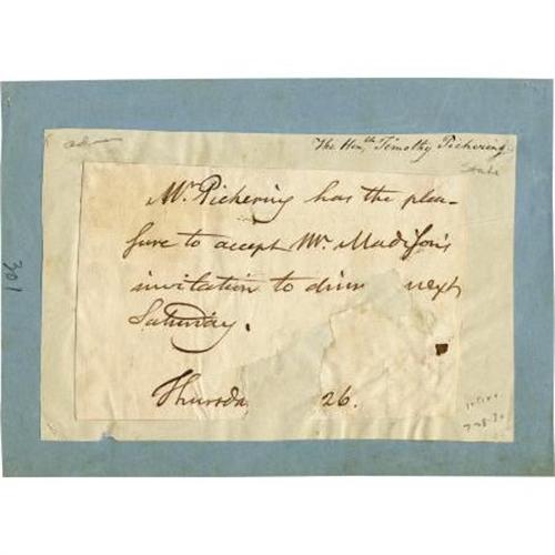 <B>Secretary of State Timothy Pickering</B></I> <B>Autograph Note Signed</B></I> 4.75” x 3”, n.d., n.p., mounted on another sheet of paper. “Mr. Pickering has the pleasure to accept Mr. Madison’s invitation to dine next Saturday.” Pickering (1745-1829) was the third United States Secretary of State, serving in that office from 1795 to 1800 under Presidents George Washington and John Adams. Sections missing, else good. <I>From the collection of Henry E. Luhrs.</B></I><BR><BR><b>Shipping:</b> Flat Material, Small (<a target="_blank" href="http://www.heritageauctions.com/common/shipping.php">view shipping information</a>)