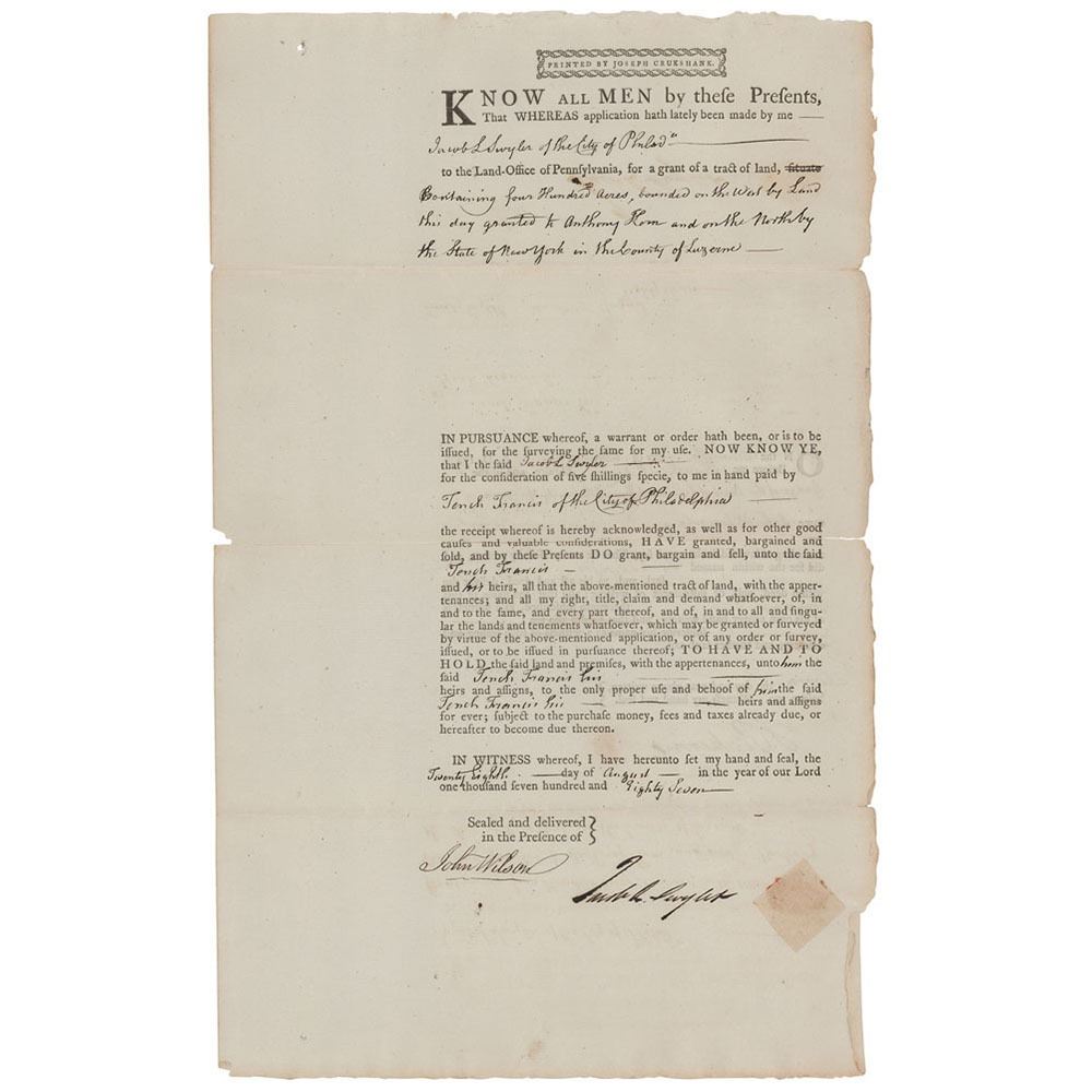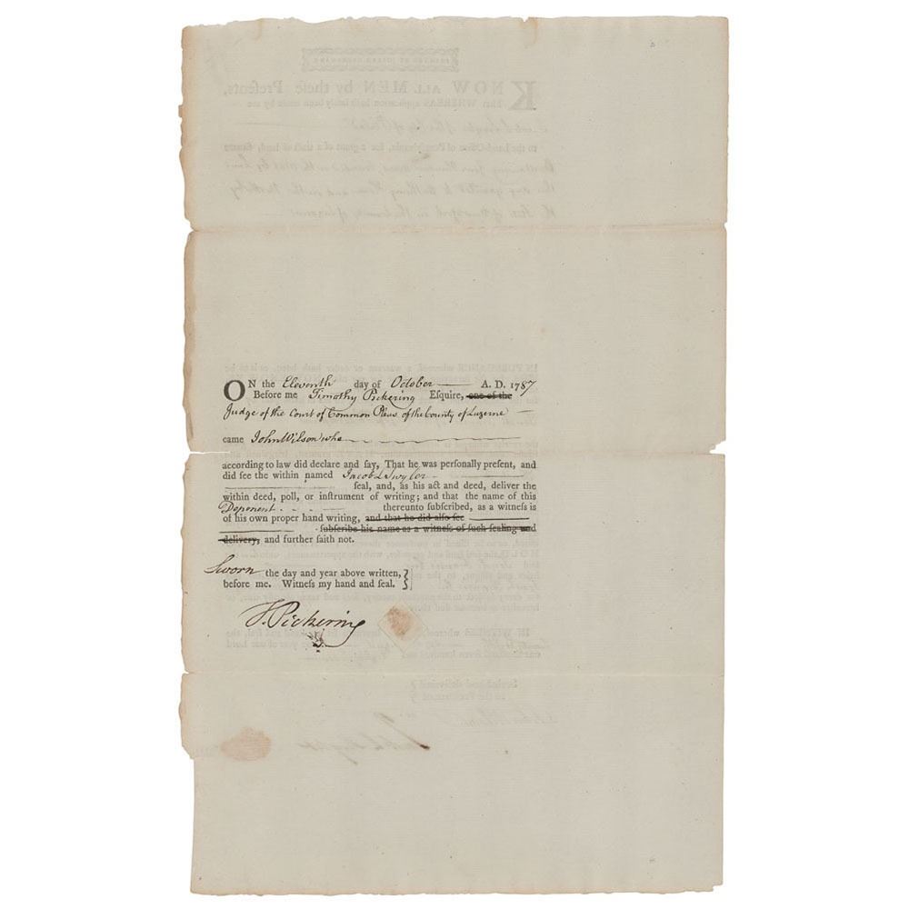 Partly-printed DS, signed “T. Pickering,†one page both sides, 8.25 x 13.5, October 11, 1787. Application to the Land-Office of Pennsylvania, which finds Jacob L. Swyler selling to Tench Francis "a tract of land containing four hundred acres, bounded on the West by Land this day granted to Anthony Kern and on the North by the State of New York in the County of Luzerne." Approved by and signed on the reverse by Pickering next to the original off-white seal. In fine condition, with small chips to the edges.