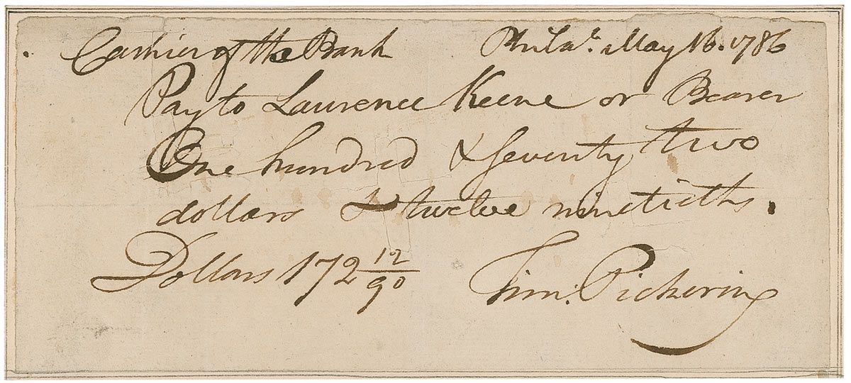 Postmaster general, secretary of war, and secretary of state under Washington (1745–1829). Manuscript check, 7.25 x 3.25 affixed to a slightly larger sheet, filled out and signed by Pickering, payable to Laurence Keene or Bearer for $172.12, May 16, 1786. In very good condition, with light intersecting folds, light toning, and unobtrusive cancellation cuts, one of which affects the first few letters of the last name.