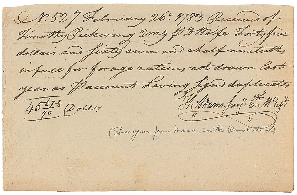ADS, signed “Timothy Pickering QMG” in the text, one page, 8 x 5, February 26, 1783. Document prepared by Pickering as a receipt of his payment for “forage rations” to a surgeon in the 6th Massachusetts Regiment. Uniform toning, light scattered soiling, and a ballpoint identification notation to the bottom, otherwise fine condition.