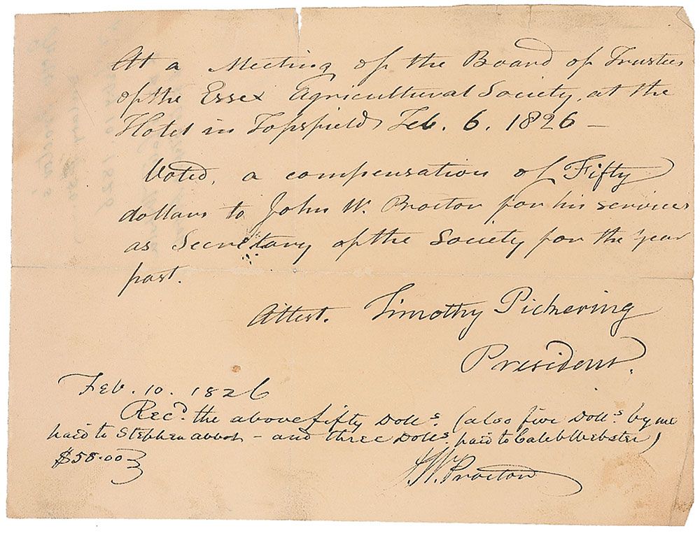 Postmaster general, secretary of war, and secretary of state under Washington (1745–1829). ADS, one page, 8 x 6, February 10, 1826. Financial document. In part: “At a meeting of the Board of Trustees of the Essex Agricultural Society, at the Hotel in Topsfield Feb. 6 1826.—Noted, a compensation of Fifty dollars to John W. Proctor for his services as Secretary of the Society for the year past.” Boldly signed at the conclusion by Pickering and countersigned by Proctor to confirm his receipt of the payment. Central vertical and horizontal folds (small edge separations) and a few creases, otherwise fine condition.