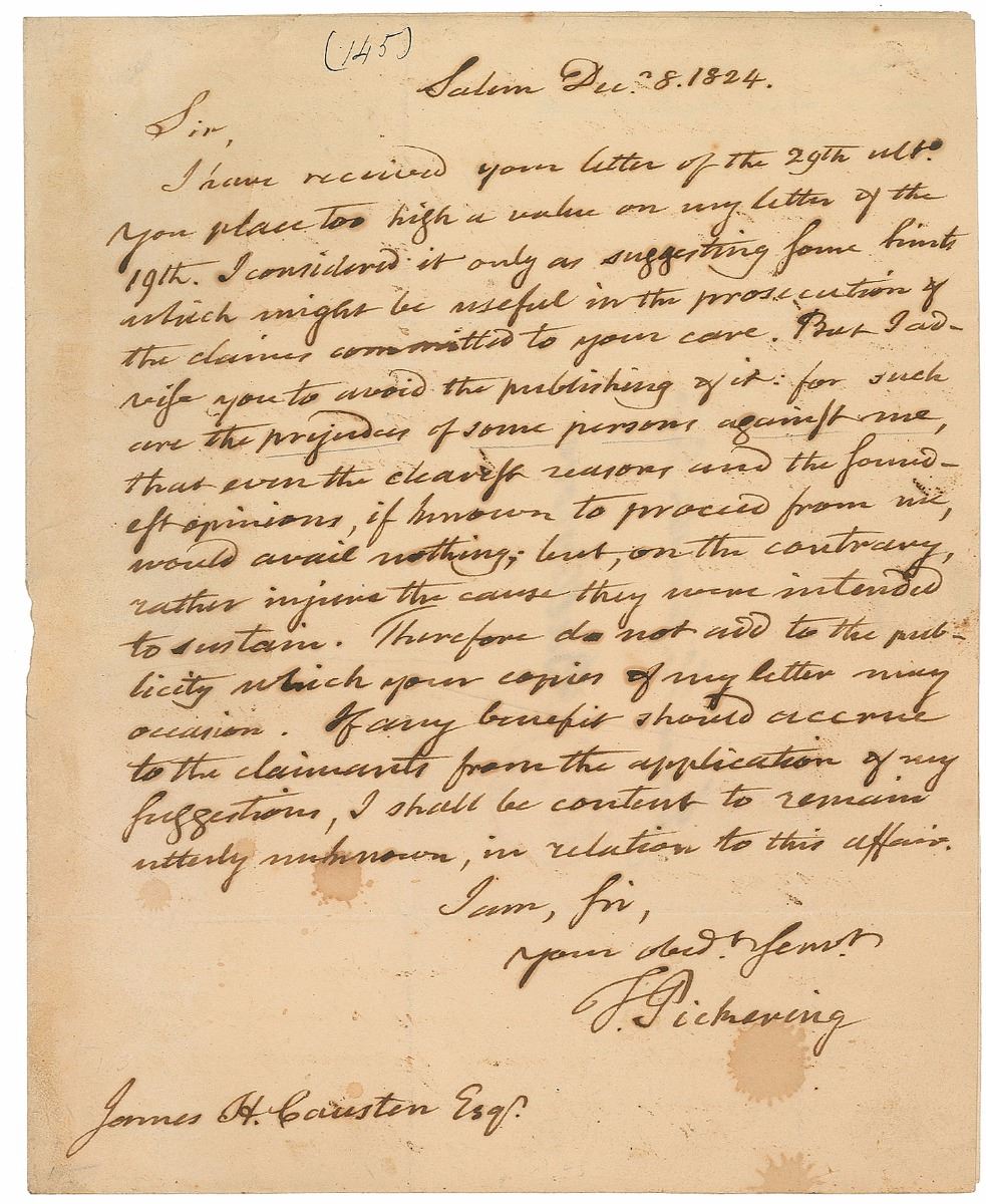 Postmaster general, secretary of war, and secretary of state under Washington (1745–1829). ALS signed “T. Pickering,” one page, 7.75 x 9.5, December 8, 1824. Letter to James H. Causten. In part: “You place too high a value on my letter…I considered it only as suggesting some hints which might be useful in the prosecution of the claims committed to your care. But I advise you to avoid the publishing of it: for such are the prejudices of some persons against me, that even the clearest reasons and the soundest opinions, if known to proceed from me, would avail nothing; but, on the contrary, rather injure the cause they were intended to sustain. Therefore do not add to the publicity which your copies of my letter may occasion. If any benefit should accrue to the claimants from the application of my suggestions, I shall be content to remain utterly unknown, in relation to this affair.” Intersecting folds, scattered spots of dampstaining and light toning, otherwise fine condition.