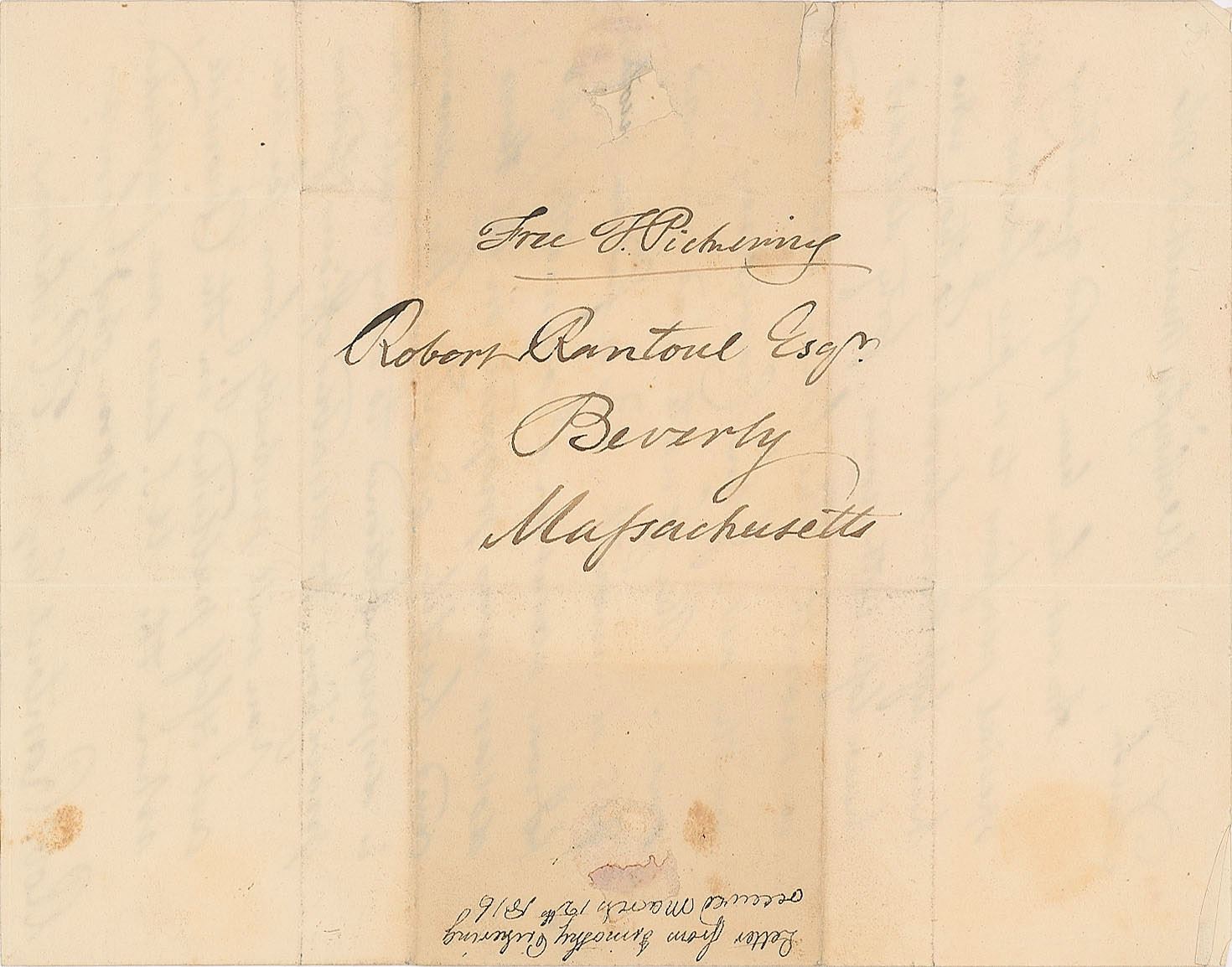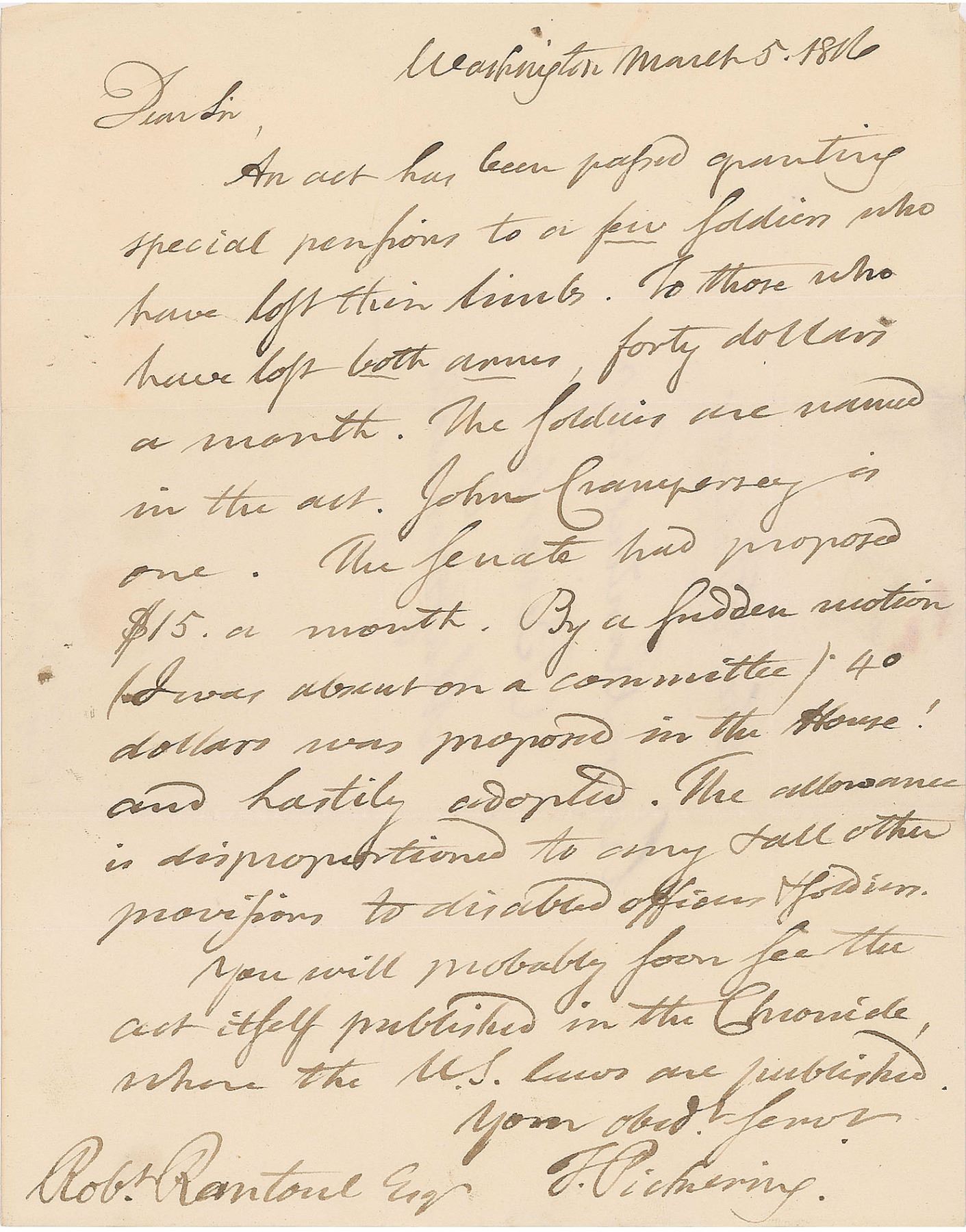 Postmaster general, secretary of war, and secretary of state under Washington (1745–1829). ALS signed “T. Pickering,” one page, 7.75 x 9.75, March 5, 1816. Letter to Robert Rantoul, in part: "An act has been passed granting special pensions to a few soldiers who have lost their limbs. To those who have lost both arms, forty dollars a month. The soldiers are named in the act. John Crampersey is one. The Senate had proposed $15 a month. By a sudden motion (I was absent on a committee) 40 dollars was proposed in the House! and hastily adopted. The allowance is disproportioned to my & all other provisions to disabled officers & soldiers. You will probably soon see the act itself published in the Chronicle, where the U.S. laws are published." Addressed on the integral address leaf in Pickering's hand, and franked in the upper right, "Free, T. Pickering." In fine condition, with seal-related paper loss to the integral free-franked address leaf.